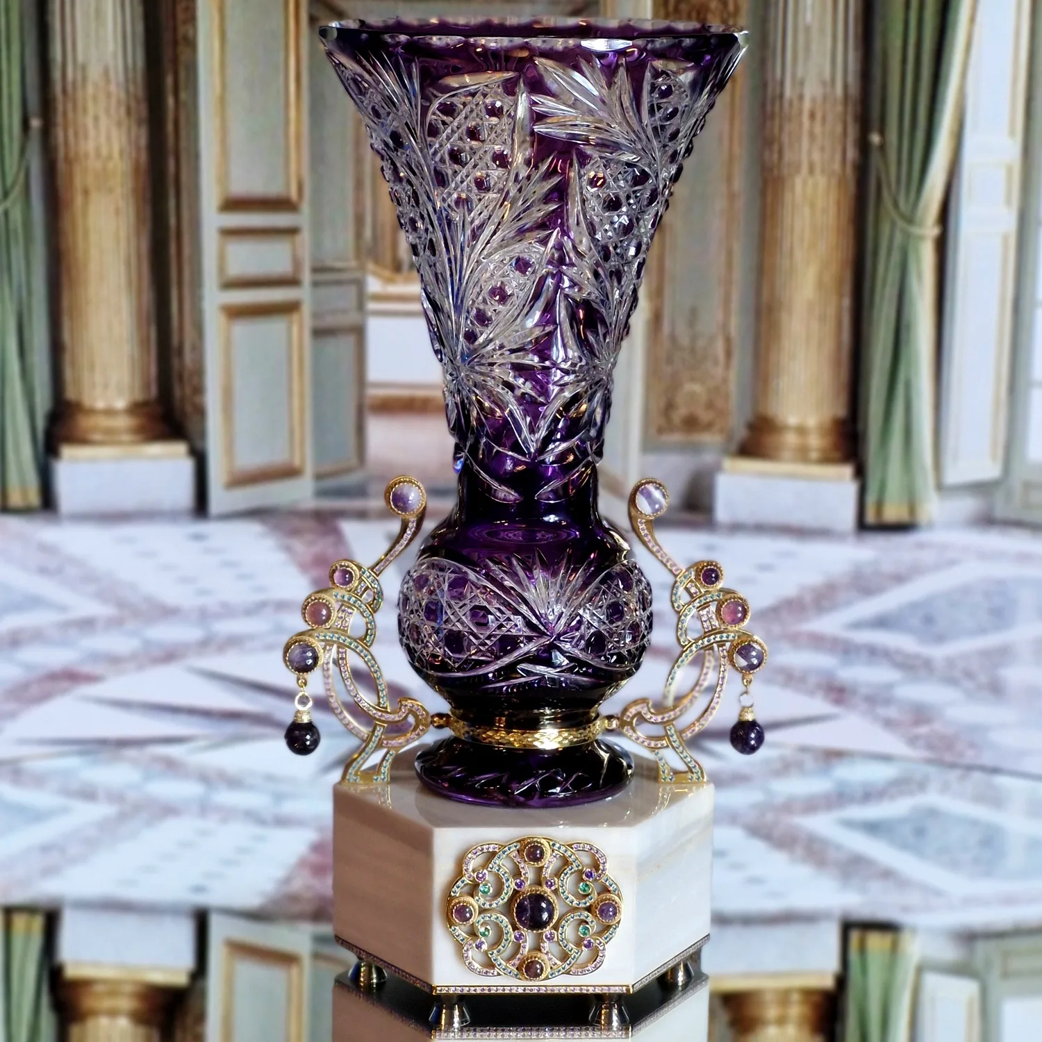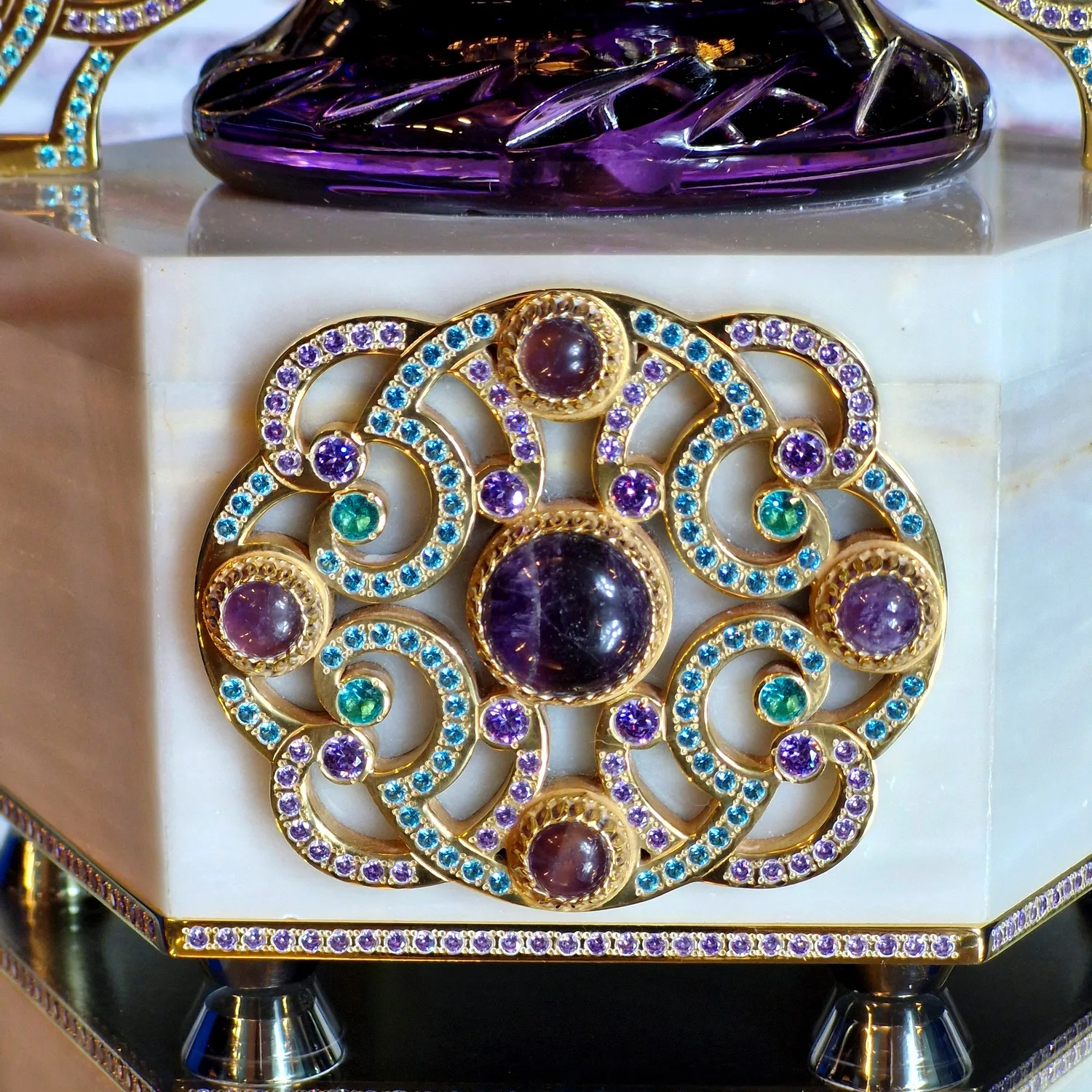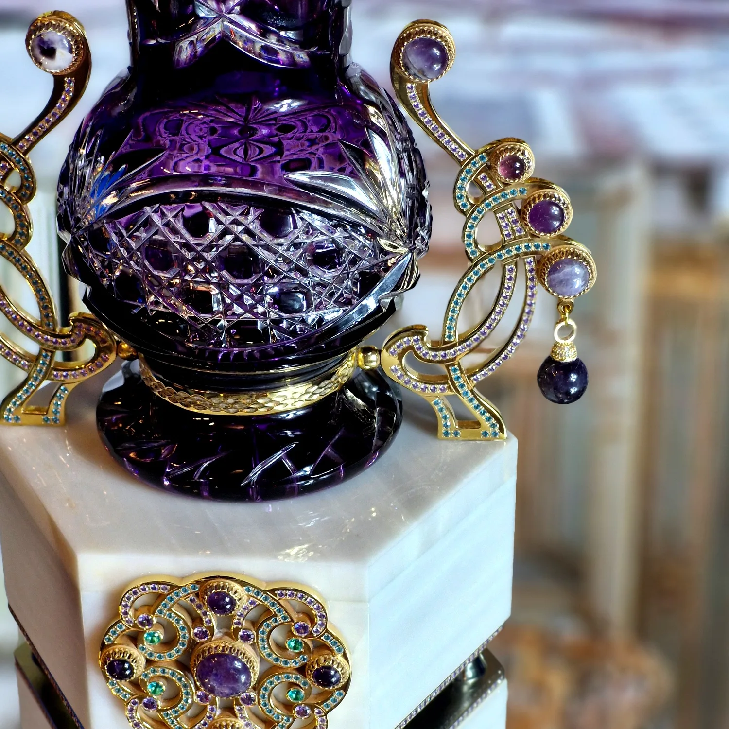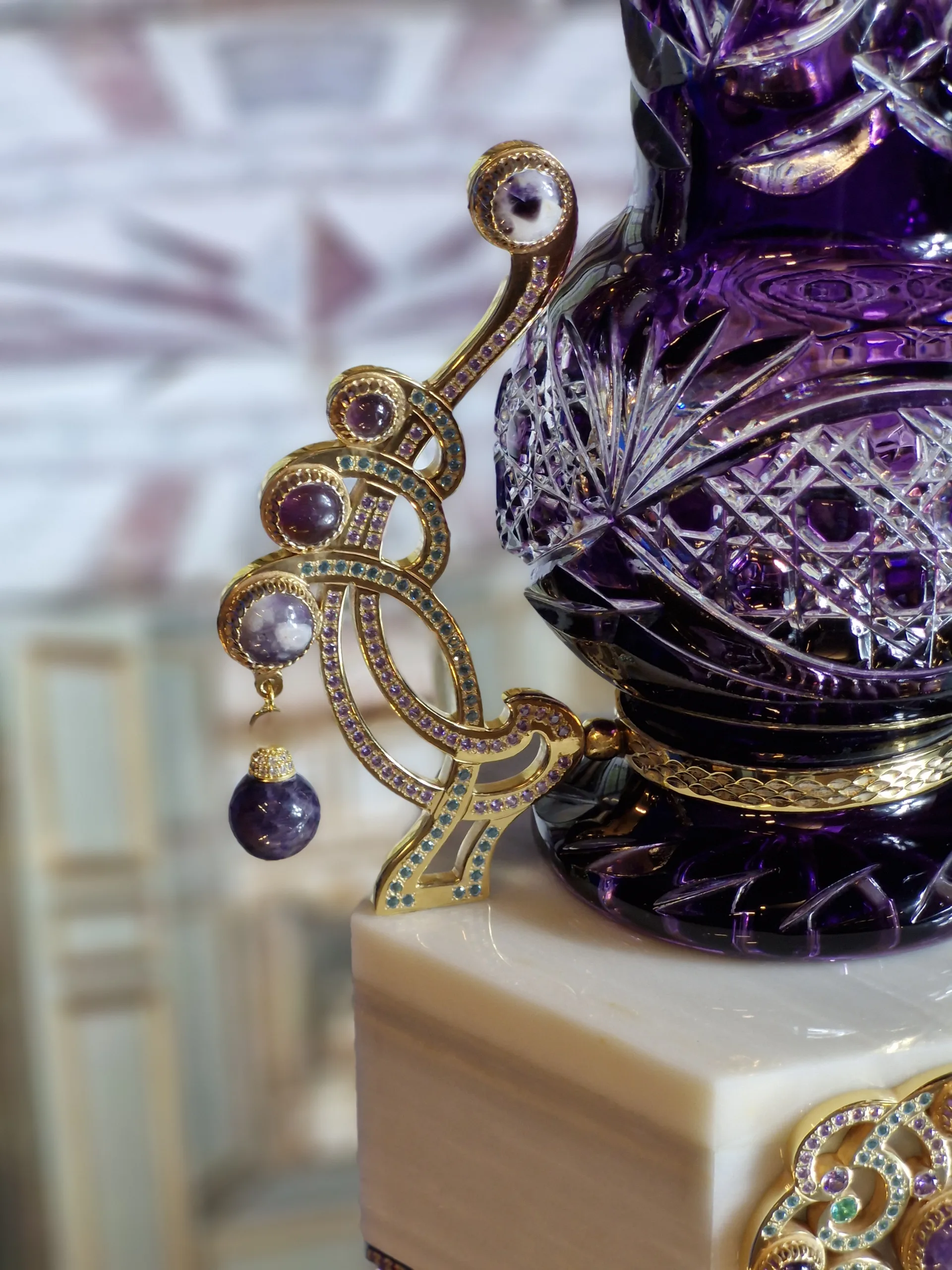 Её основание — величественная постаментная часть, исполненная из белого мрамора, украшенная утончённой золотой инкрустацией с благородными камнями. Оно придаёт изделию устойчивость и подчёркивает его статус — почти культовый, как у предмета, хранимого в покоях королевской особы. Декоративные элементы в форме изогнутых ручек с подвесками-аметистами танцуют при малейшем движении воздуха, даря ощущение лёгкости и грации. Они напоминают о каплях росы на лепестках виноградной лозы, свисающей на рассвете над французским садом в сердце Версаля.