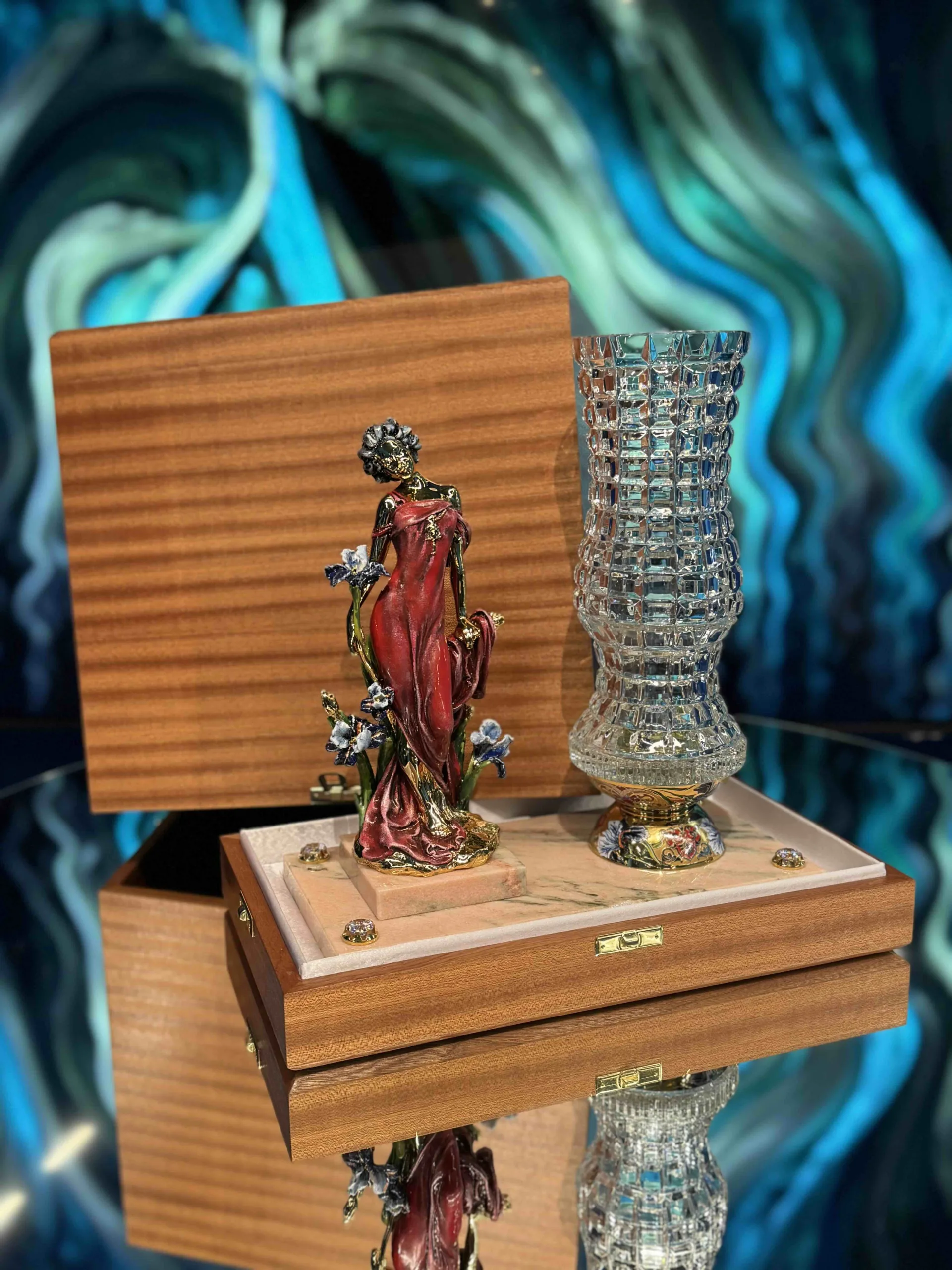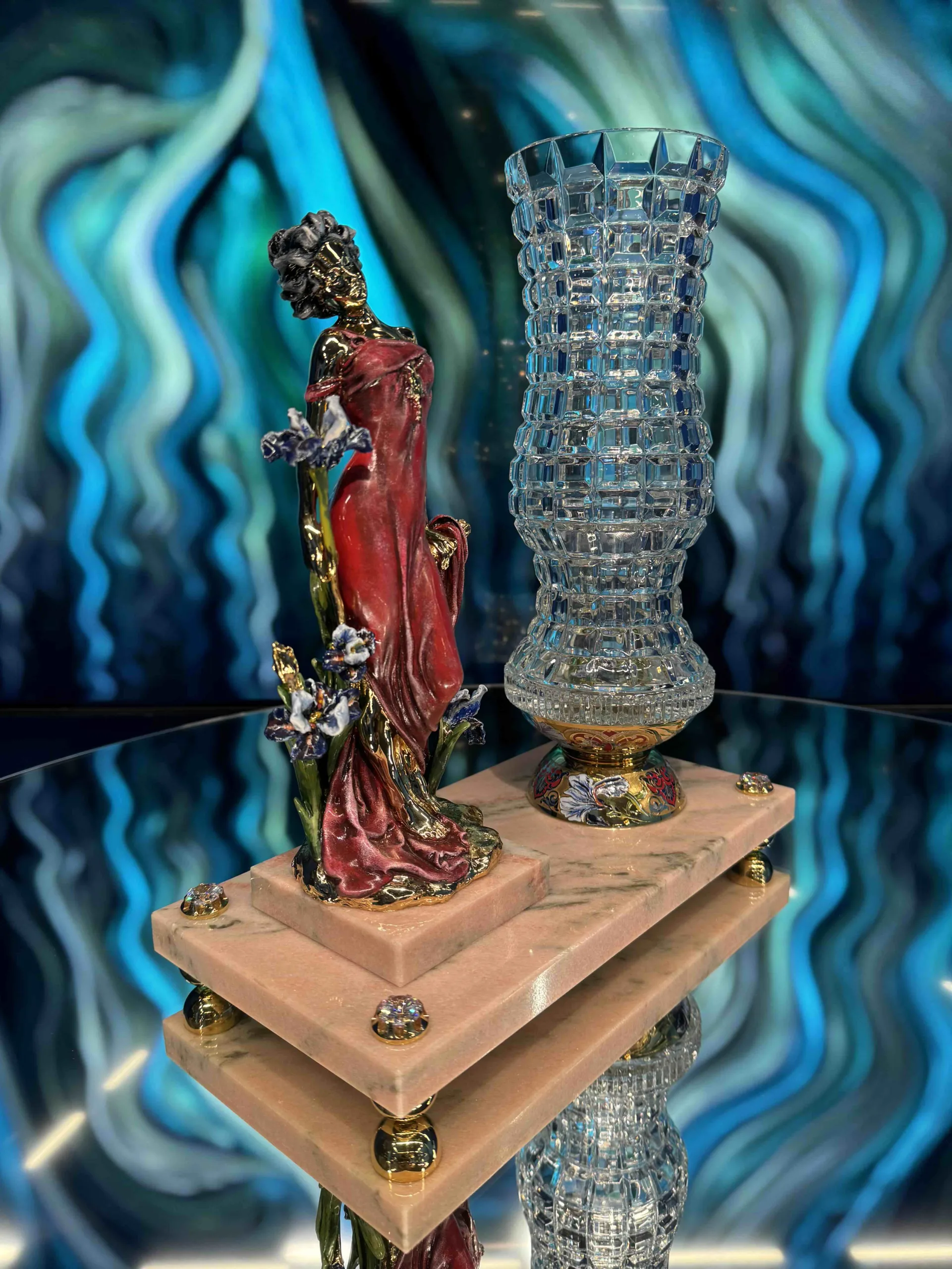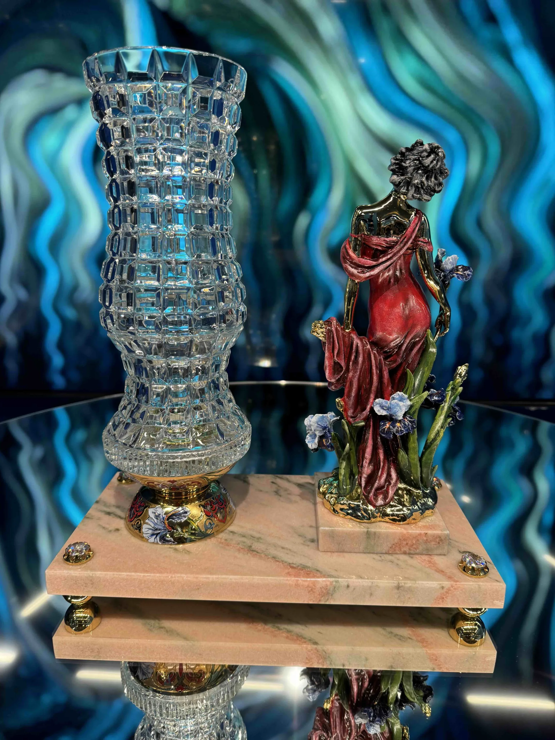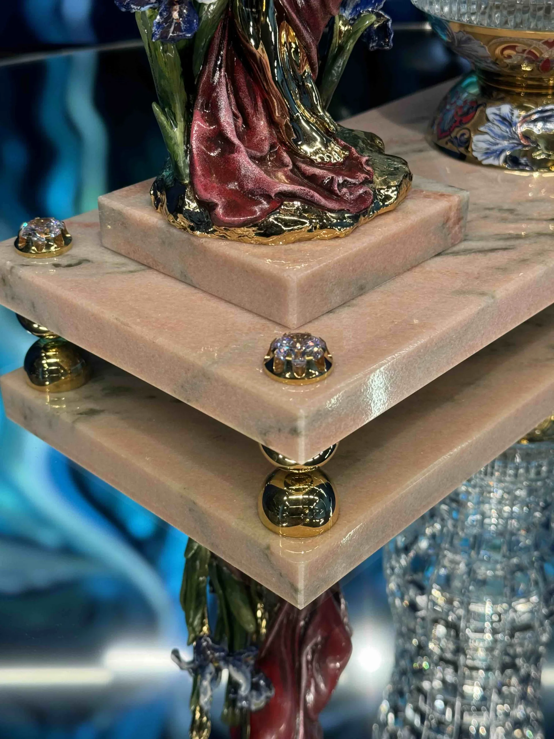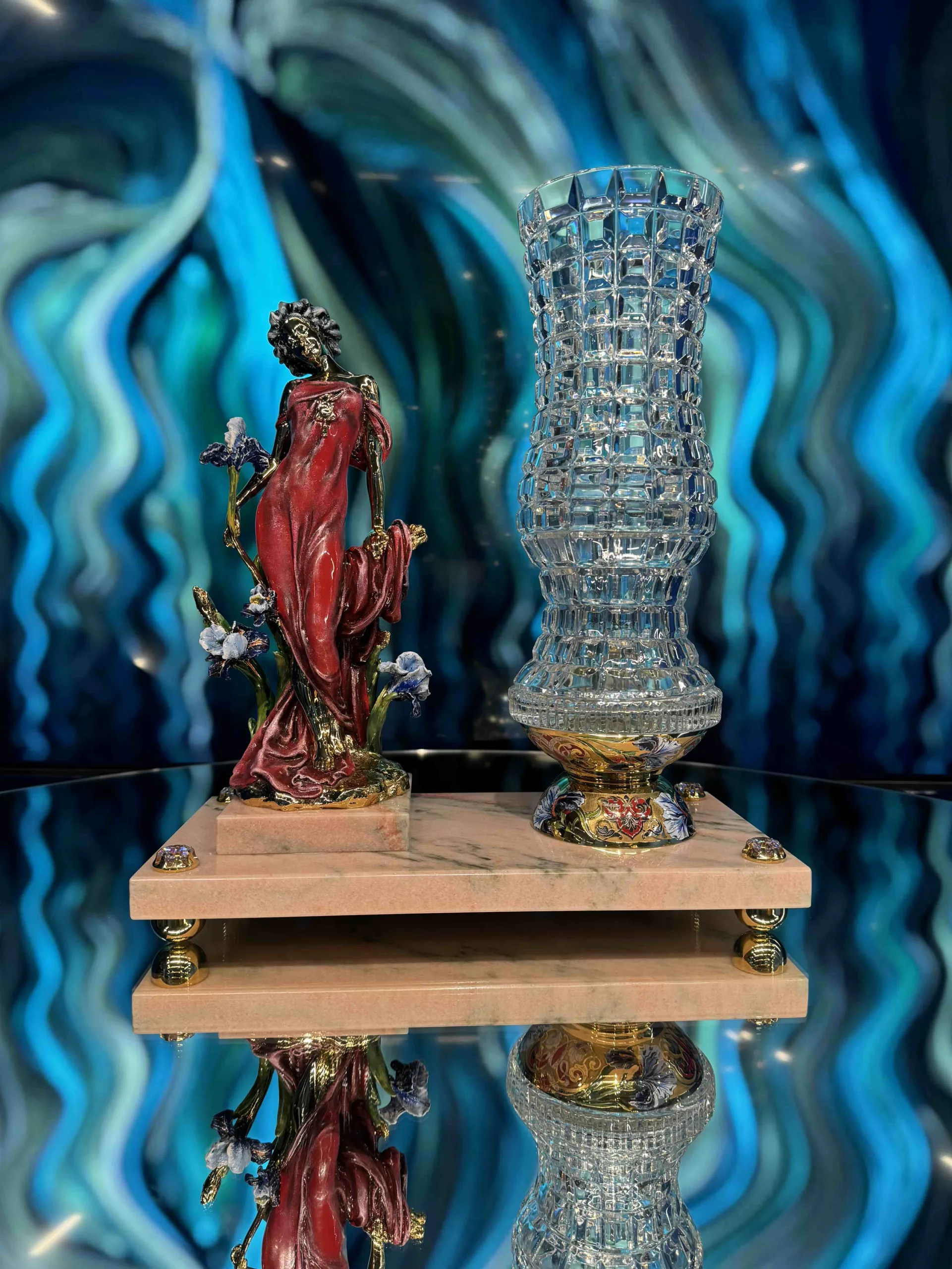 Справа ваза из рельефного хрусталя в классическом исполнении создает единый, гармоничный ансамбль. Основание вазы украшено изящными линиями эмали, золота, что придает ей глубину и шик. Подставка из прочного, нежно-розового мрамора не просто опора, а архитектурное звено композиции, инкрустирована фианитами, имитирующими бриллианты, которые словно роса ловят каждый луч света.