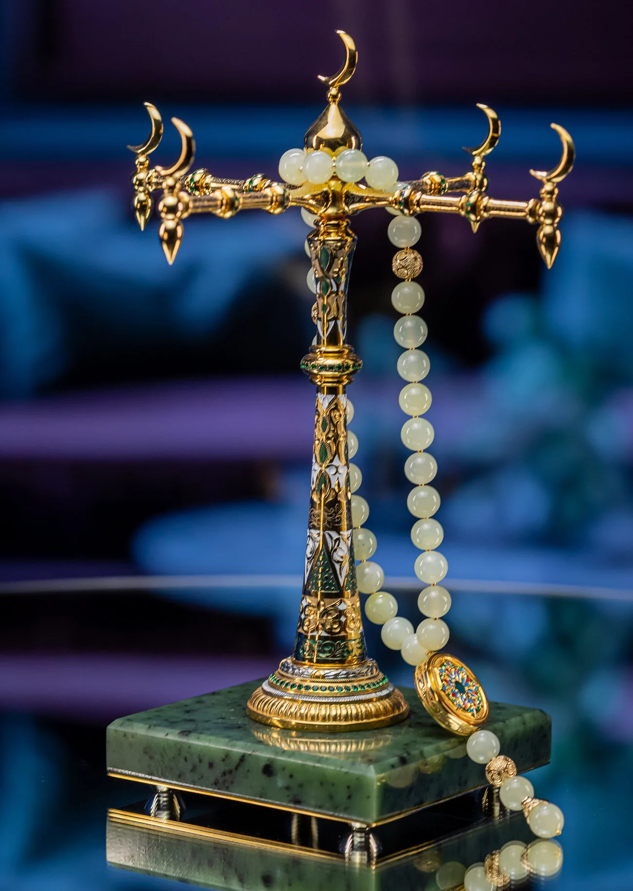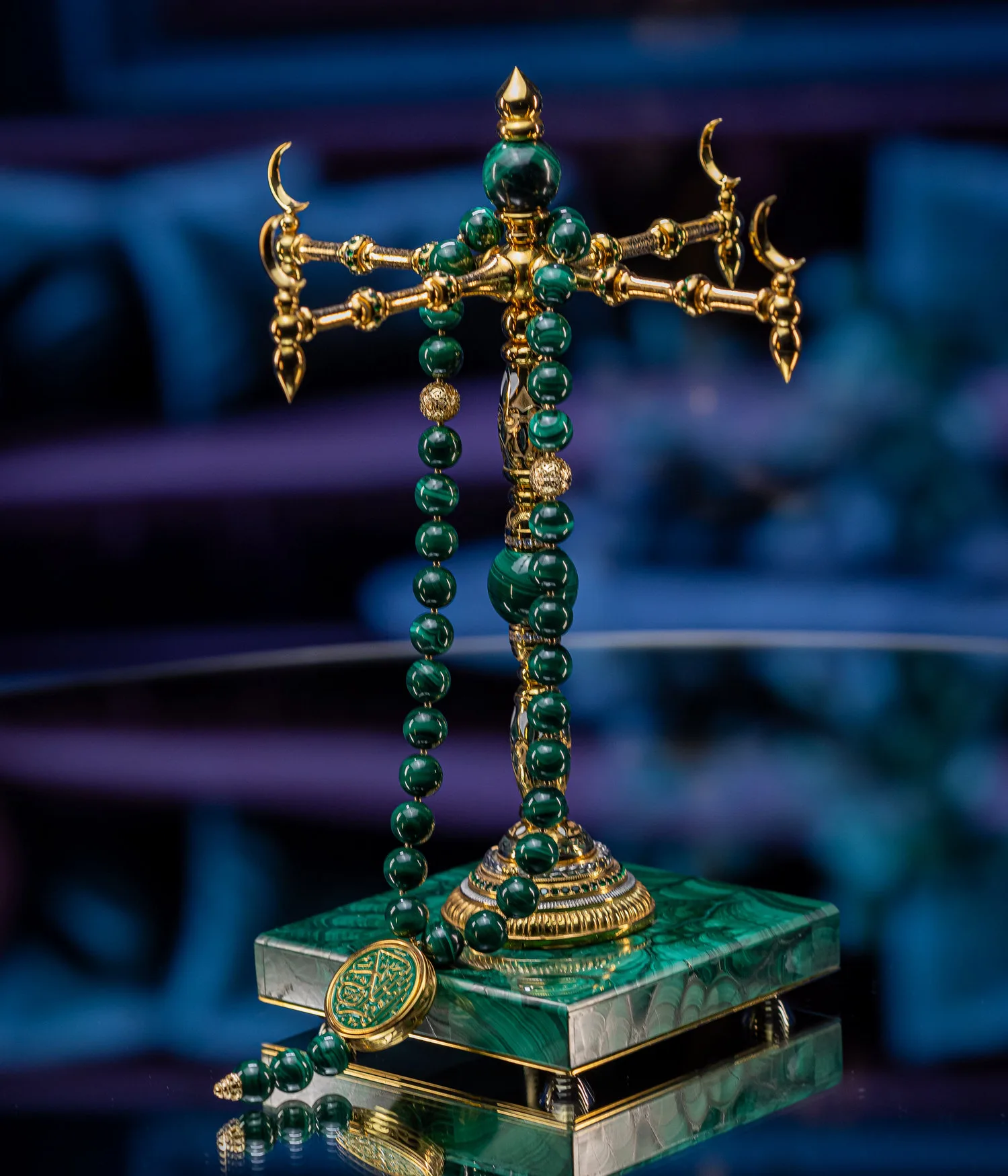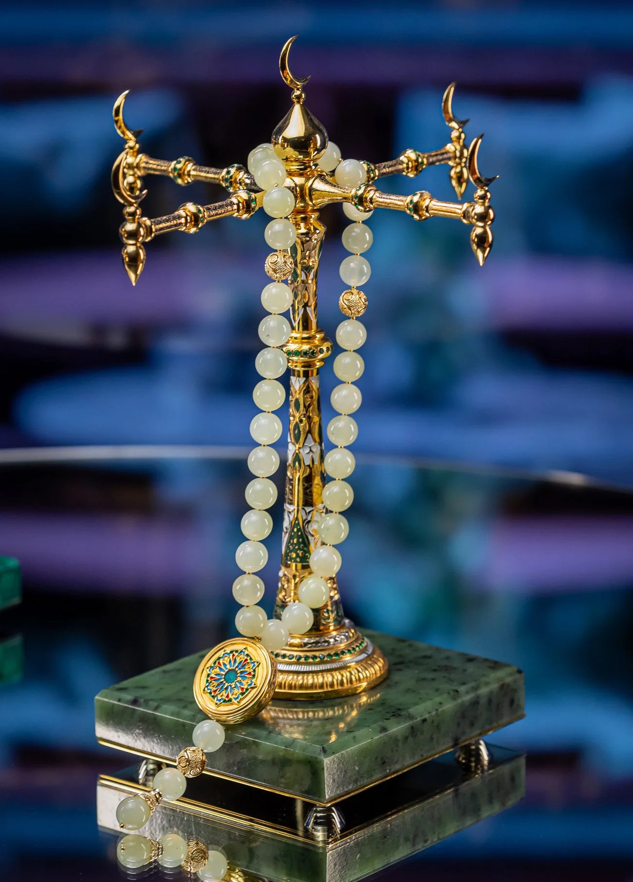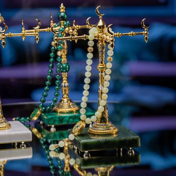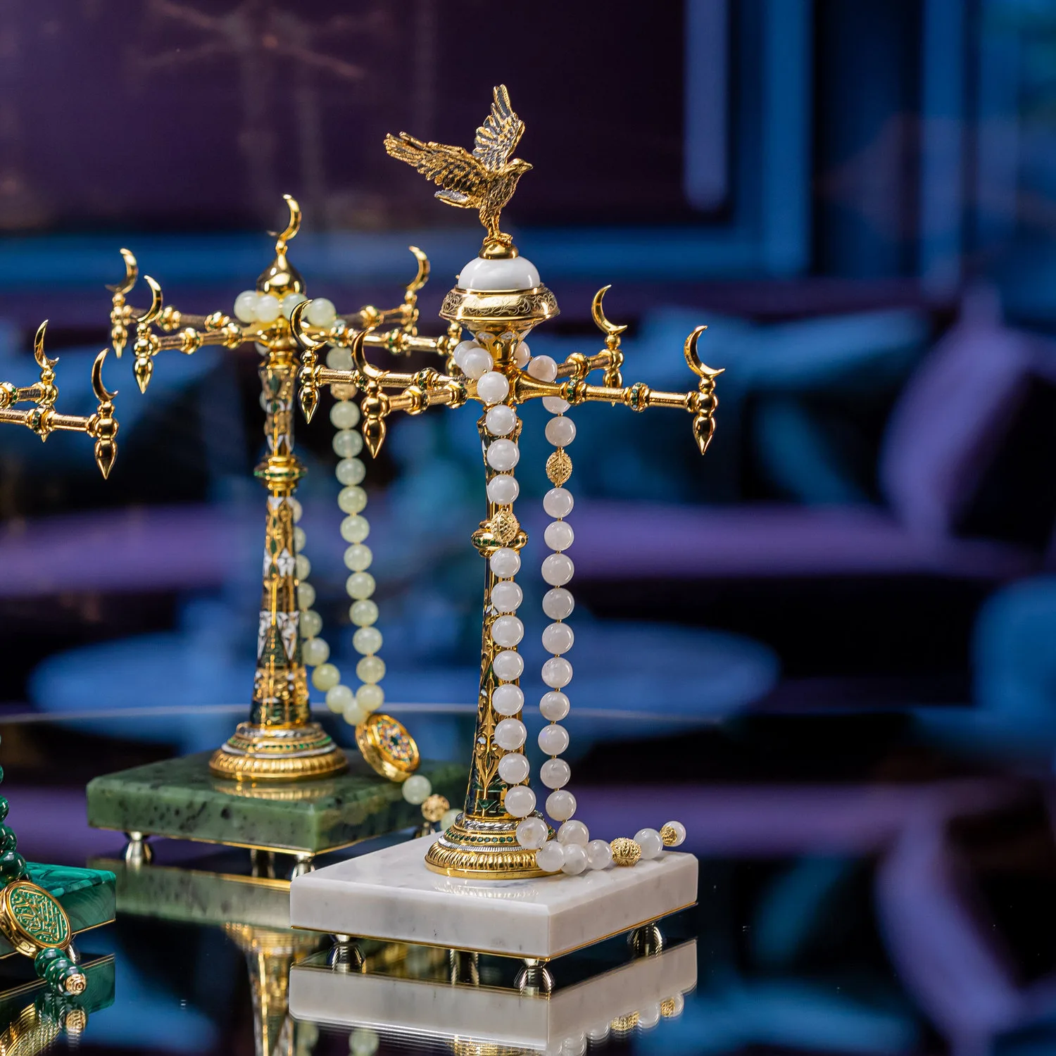 Коллекционная подставка для чёток ручной работы создана для ценителей красоты и смысла. Мастера изготавливают каждое изделие по ювелирным технологиям: основание из натурального камня, стройная позолоченная колонна, утончённые полумесяцы и фигурные навершия. Сияние металла и глубина камня подчёркивают благородство чёток, превращая их в выразительный акцент интерьера. Продуманная форма перекладин защищает нити от заломов и трения о стол, тем самым дольше сохраняются блеск и гладкость бусин. Высота стойки подходит для чёток разной длины, а несколько лучей позволяют разместить одну или несколько нитей одновременно. Компактный размер не загромождает пространство, создавая личный уголок для медитации и отдыха. В коллекции представлены варианты с разными камнями и декоративными элементами, легко подобрать подставку под характер владельца или стиль помещения. Аксессуар подчёркивает статус, бережно хранит священный атрибут и делает ежедневный ритуал особенно торжественным.