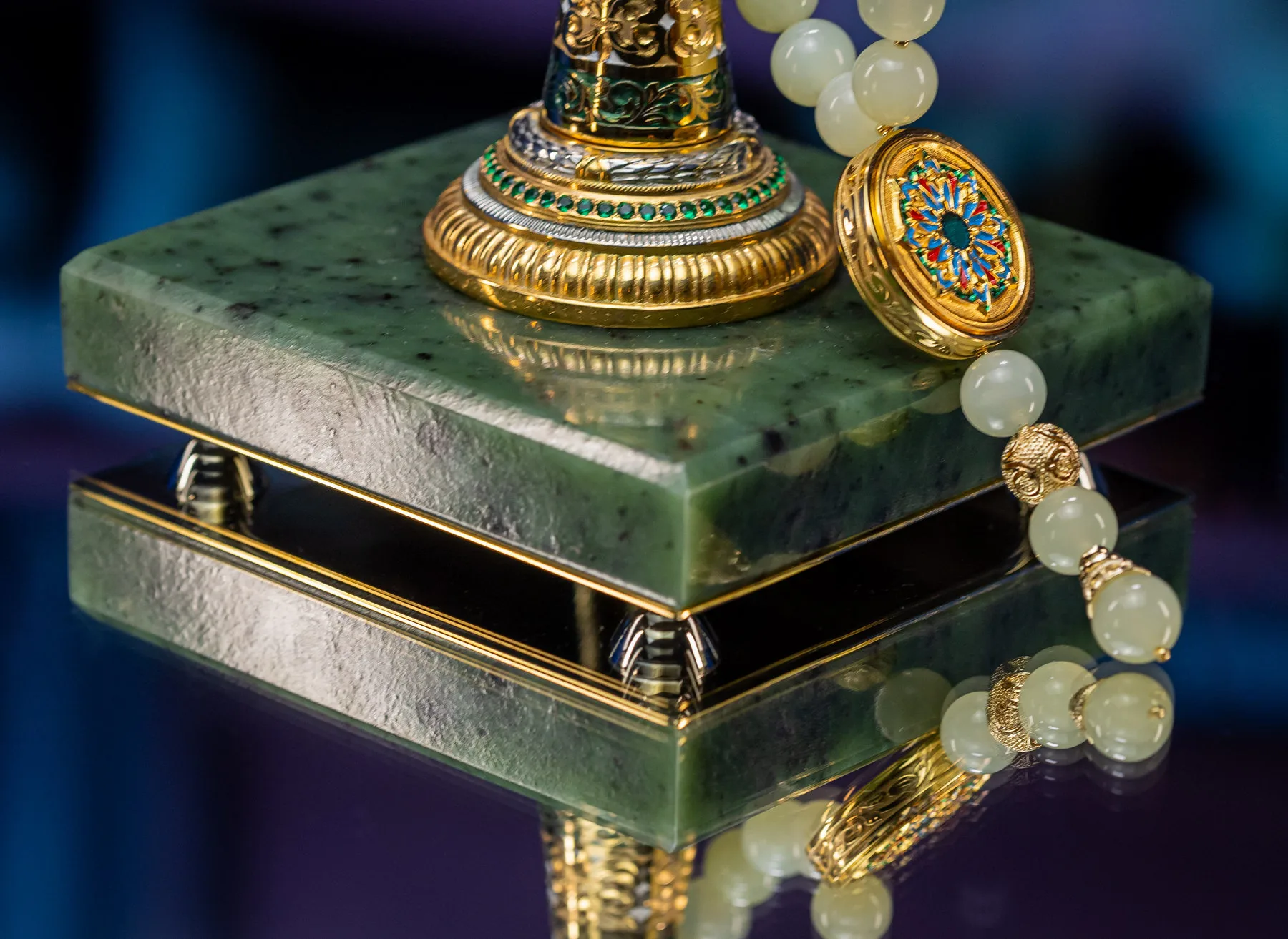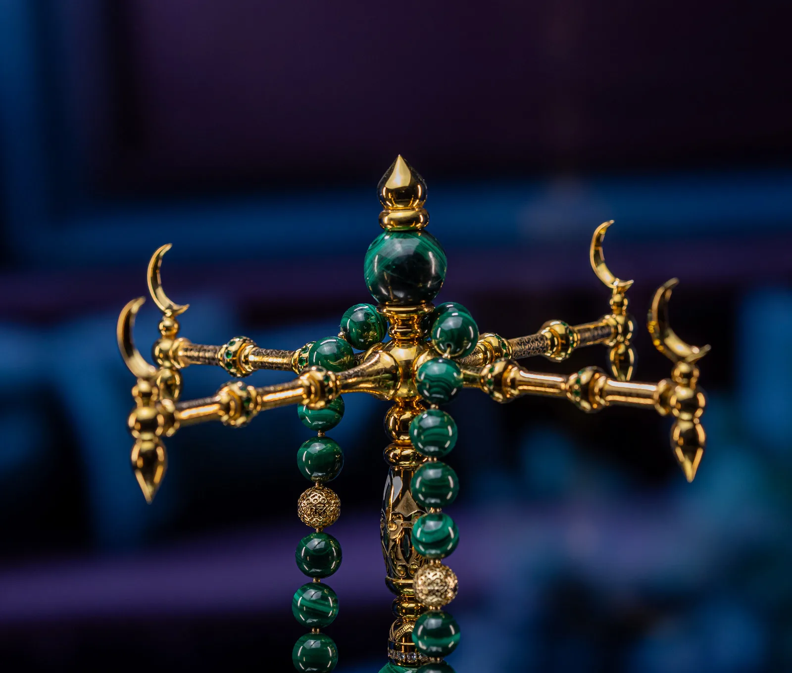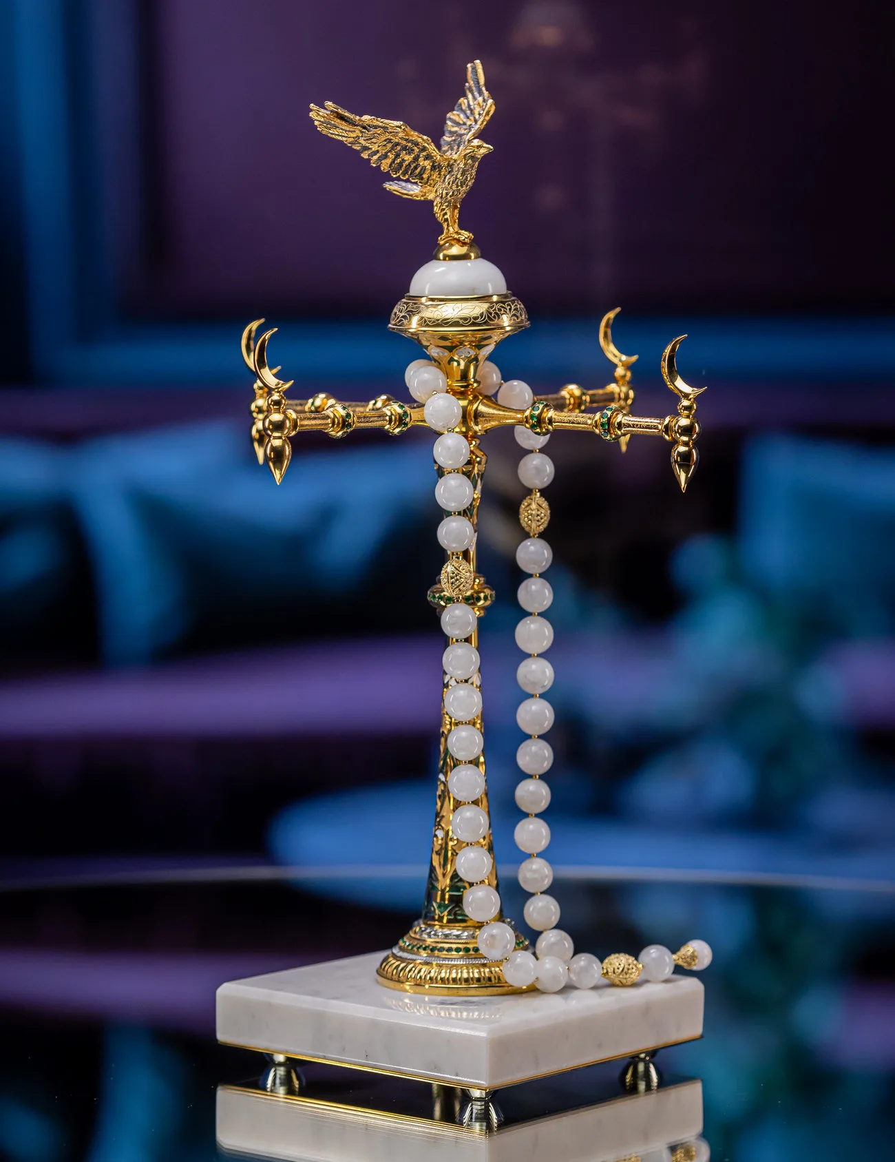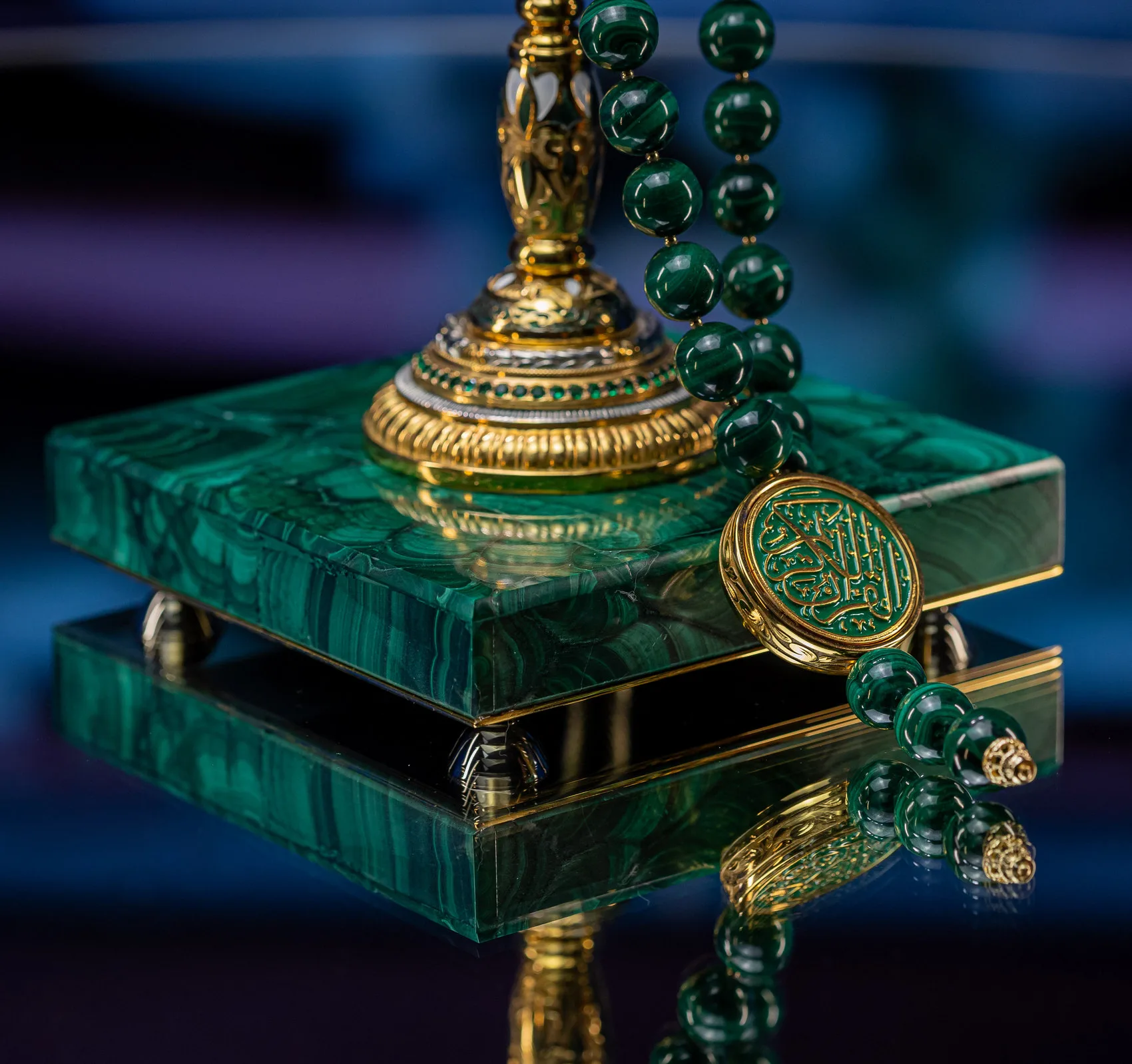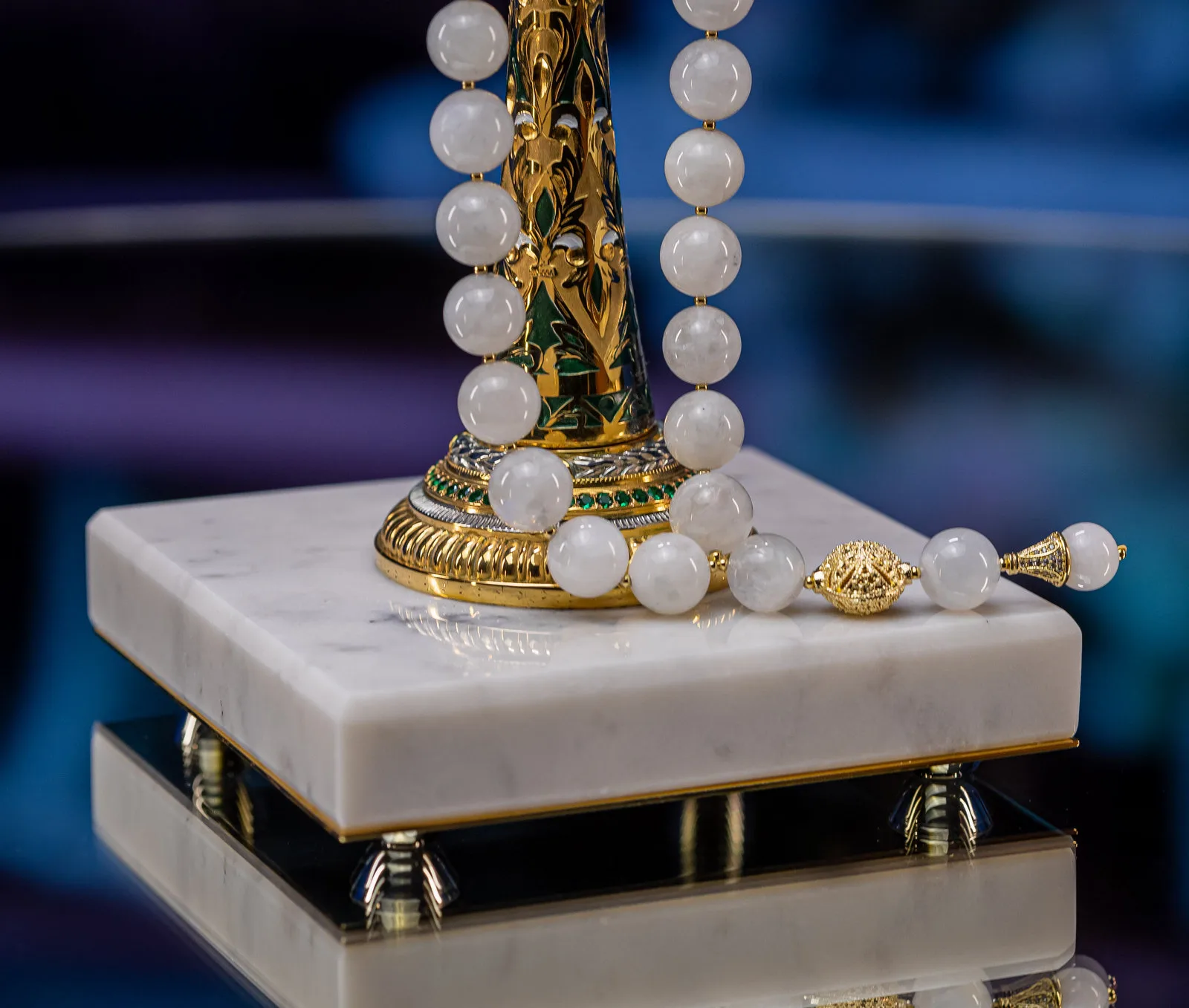 Коллекционная подставка для чёток ручной работы создана для ценителей красоты и смысла. Мастера изготавливают каждое изделие по ювелирным технологиям: основание из натурального камня, стройная позолоченная колонна, утончённые полумесяцы и фигурные навершия. Сияние металла и глубина камня подчёркивают благородство чёток, превращая их в выразительный акцент интерьера. Продуманная форма перекладин защищает нити от заломов и трения о стол, тем самым дольше сохраняются блеск и гладкость бусин. Высота стойки подходит для чёток разной длины, а несколько лучей позволяют разместить одну или несколько нитей одновременно. Компактный размер не загромождает пространство, создавая личный уголок для медитации и отдыха. В коллекции представлены варианты с разными камнями и декоративными элементами, легко подобрать подставку под характер владельца или стиль помещения. Аксессуар подчёркивает статус, бережно хранит священный атрибут и делает ежедневный ритуал особенно торжественным.