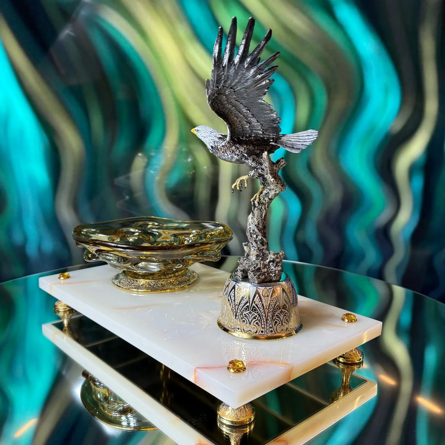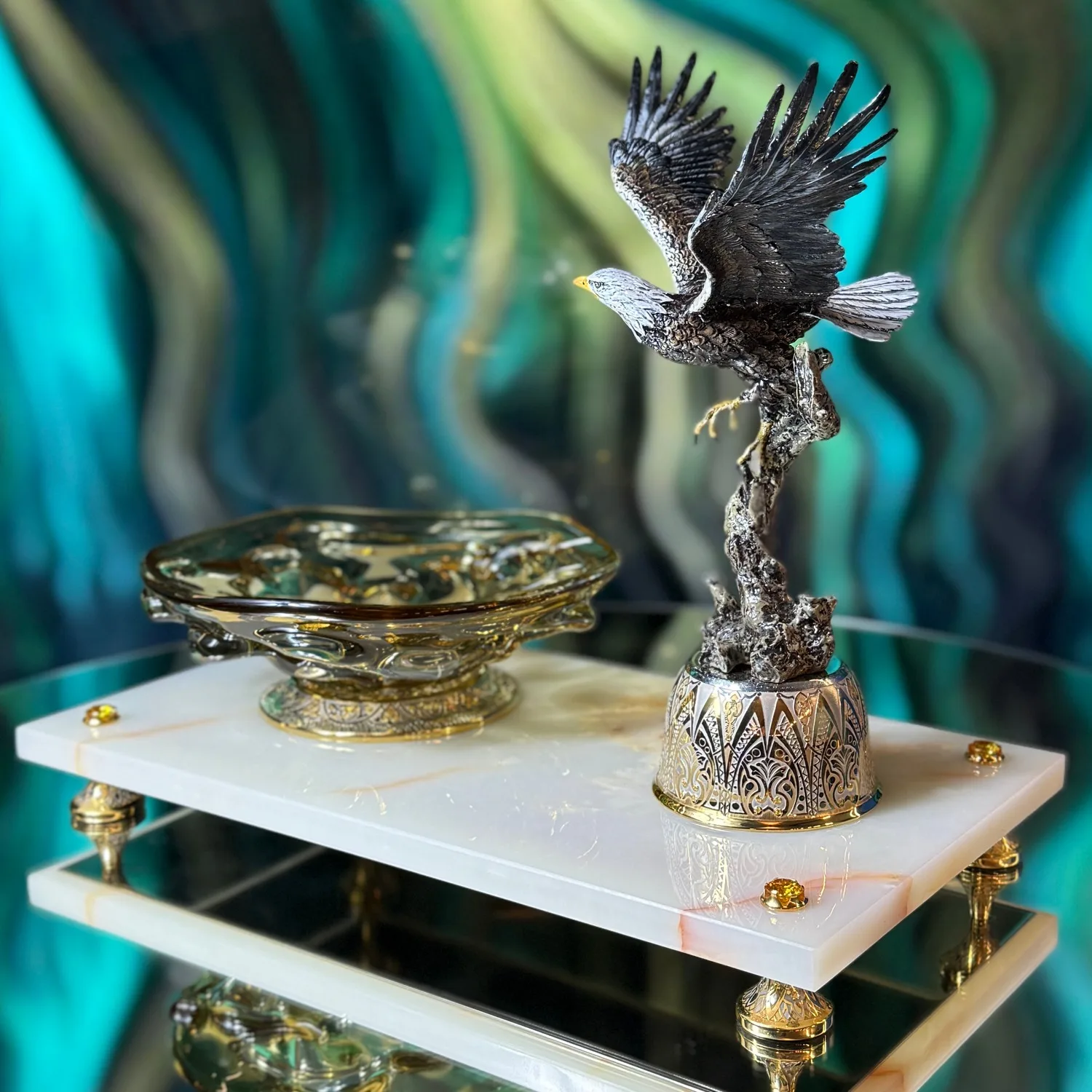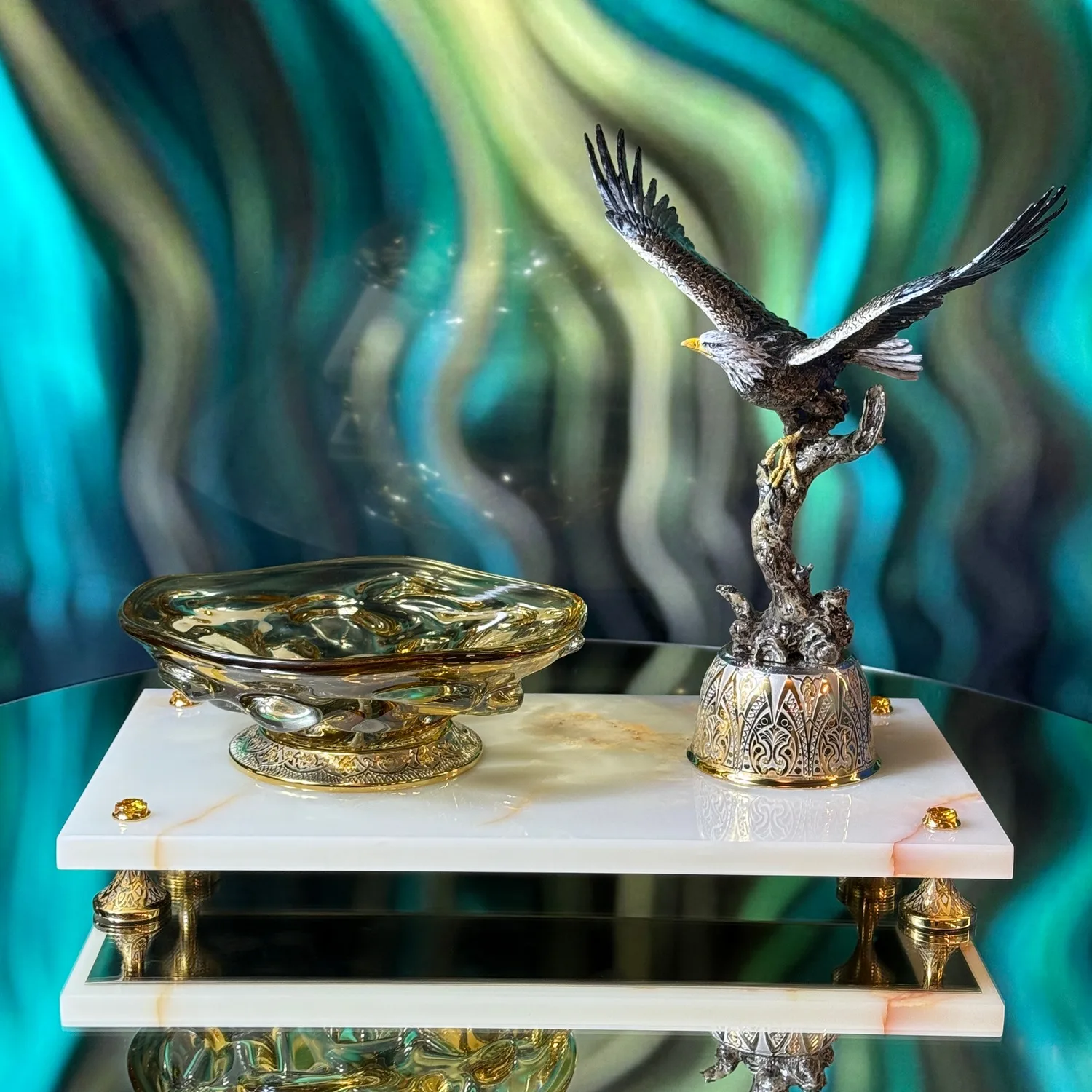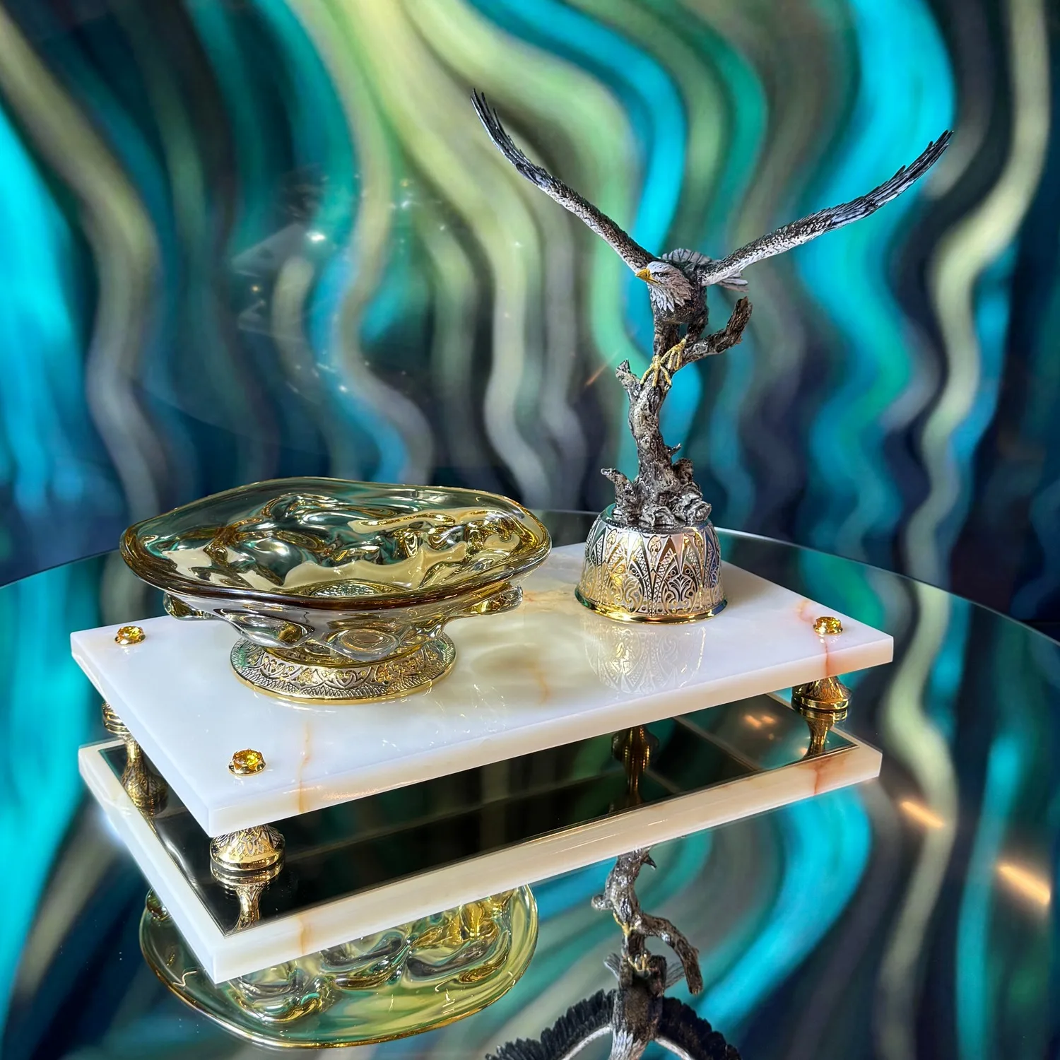 Изящная композиция воплощает гармонию природы и роскоши. Основой служит благородный оникс, чья нежная структура обрамлена изысканными ножками из литья с позолотой, отражая сияние мастерства. Хрустальная чаша пленяет плавными линиями и деликатными узорами, а яркие фианиты добавляют изысканный блеск, акцентируя внимание на каждой детали. Завершающий штрих — филигранная фигура орла, выполненная с тонкими прорисовками, олицетворяющего силу и стремление к высоким целям. Шедевр, несущий в себе сочетание благородных материалов и искусного исполнения.