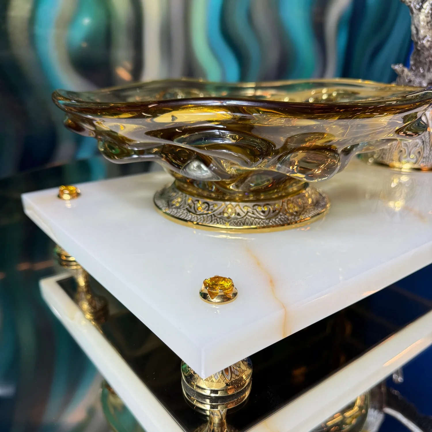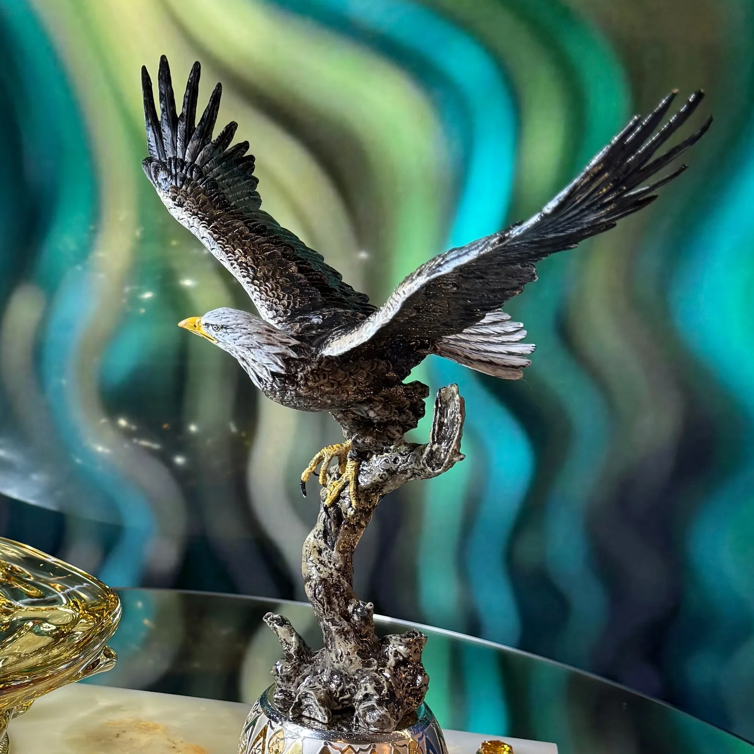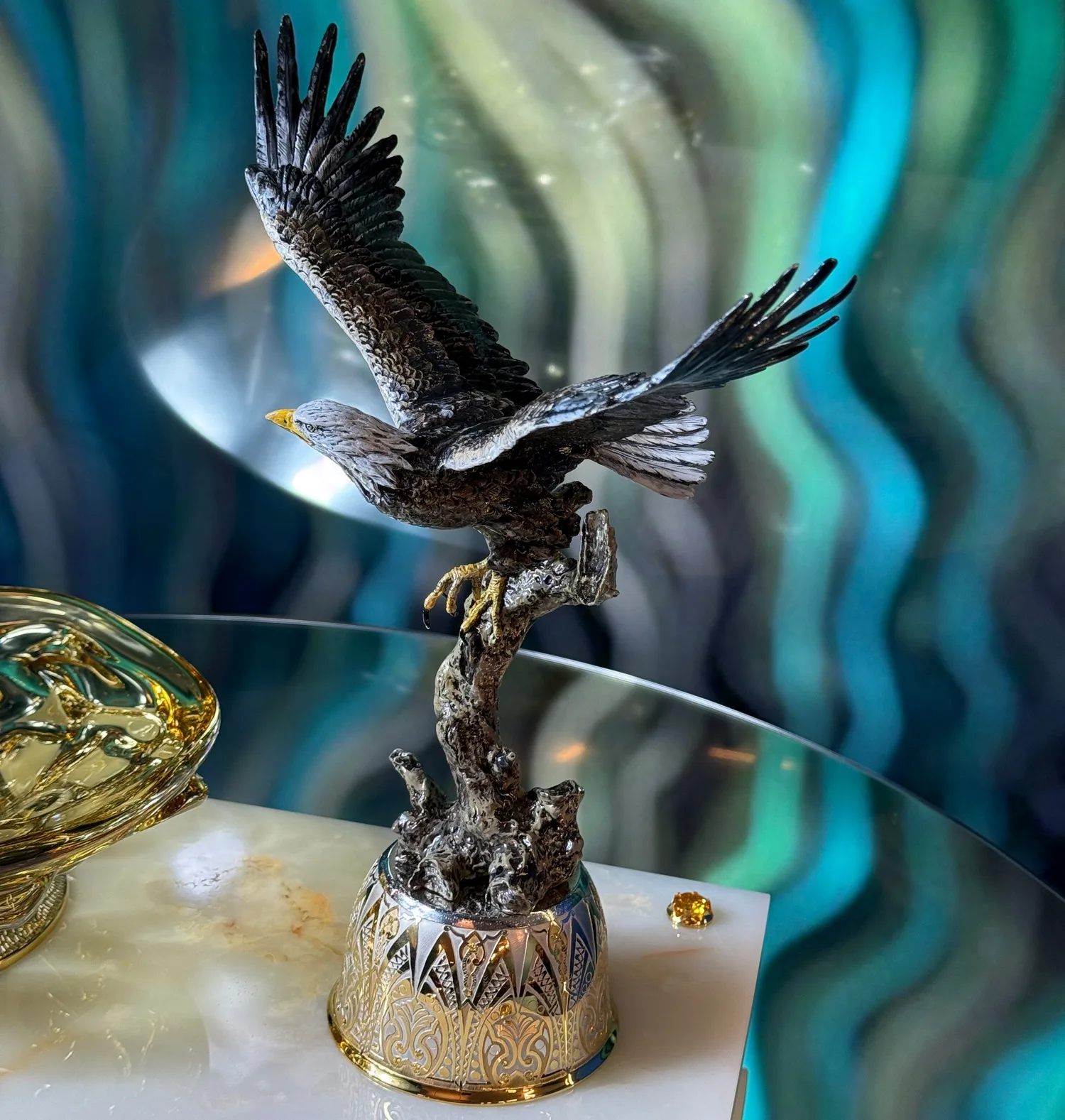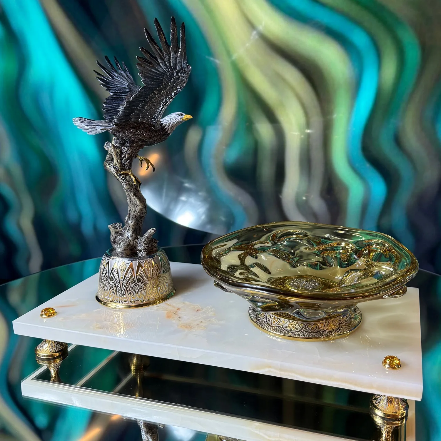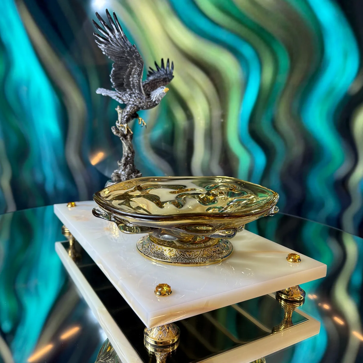 Изящная композиция воплощает гармонию природы и роскоши. Основой служит благородный оникс, чья нежная структура обрамлена изысканными ножками из литья с позолотой, отражая сияние мастерства. Хрустальная чаша пленяет плавными линиями и деликатными узорами, а яркие фианиты добавляют изысканный блеск, акцентируя внимание на каждой детали. Завершающий штрих — филигранная фигура орла, выполненная с тонкими прорисовками, олицетворяющего силу и стремление к высоким целям. Шедевр, несущий в себе сочетание благородных материалов и искусного исполнения.