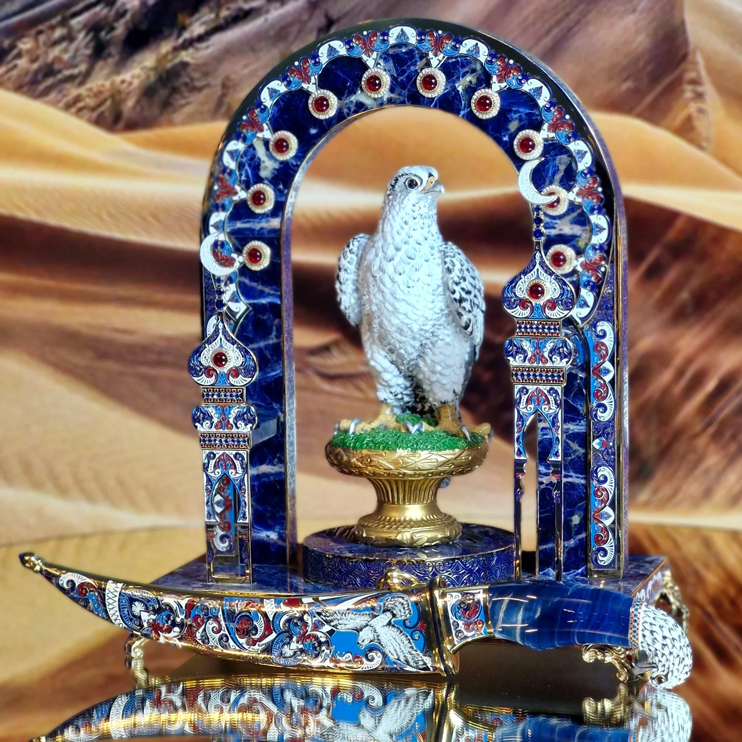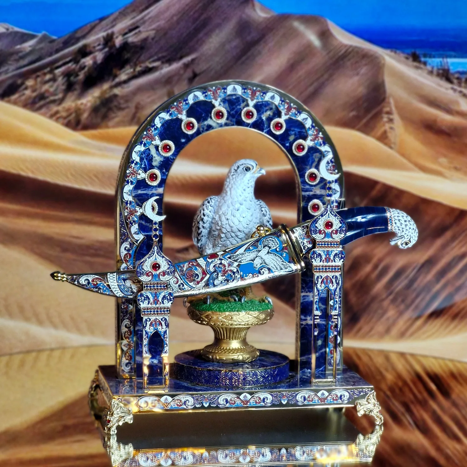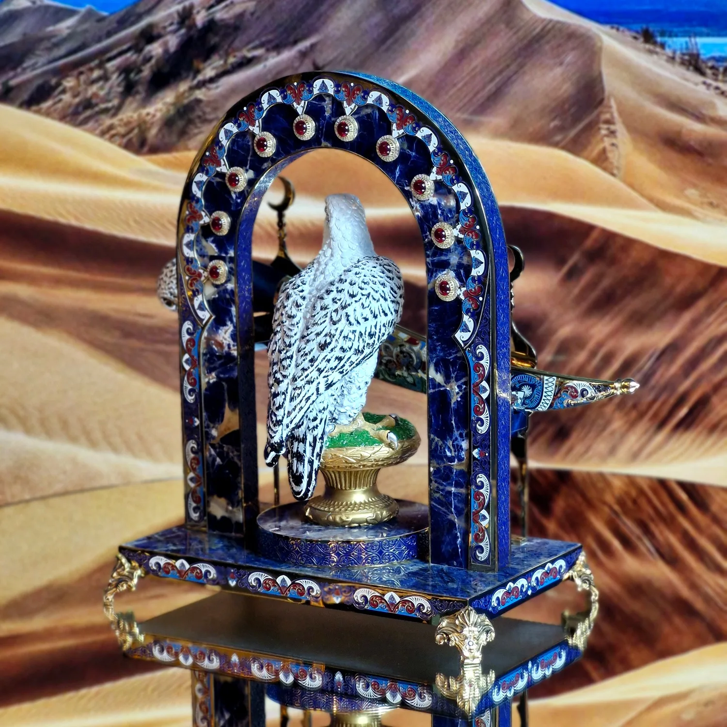 «Сапфировый страж пустыни» – словно остановленный миг восточной легенды. На фоне золотых дюн возникает арка, выложенная глубоким сапфировым тоном и усыпанная орнаментом, словно ночное небо над пустыней. В её центре – гордый сокол, немой хранитель, чей внимательный взгляд подчёркивает название композиции: страж всегда на посту.