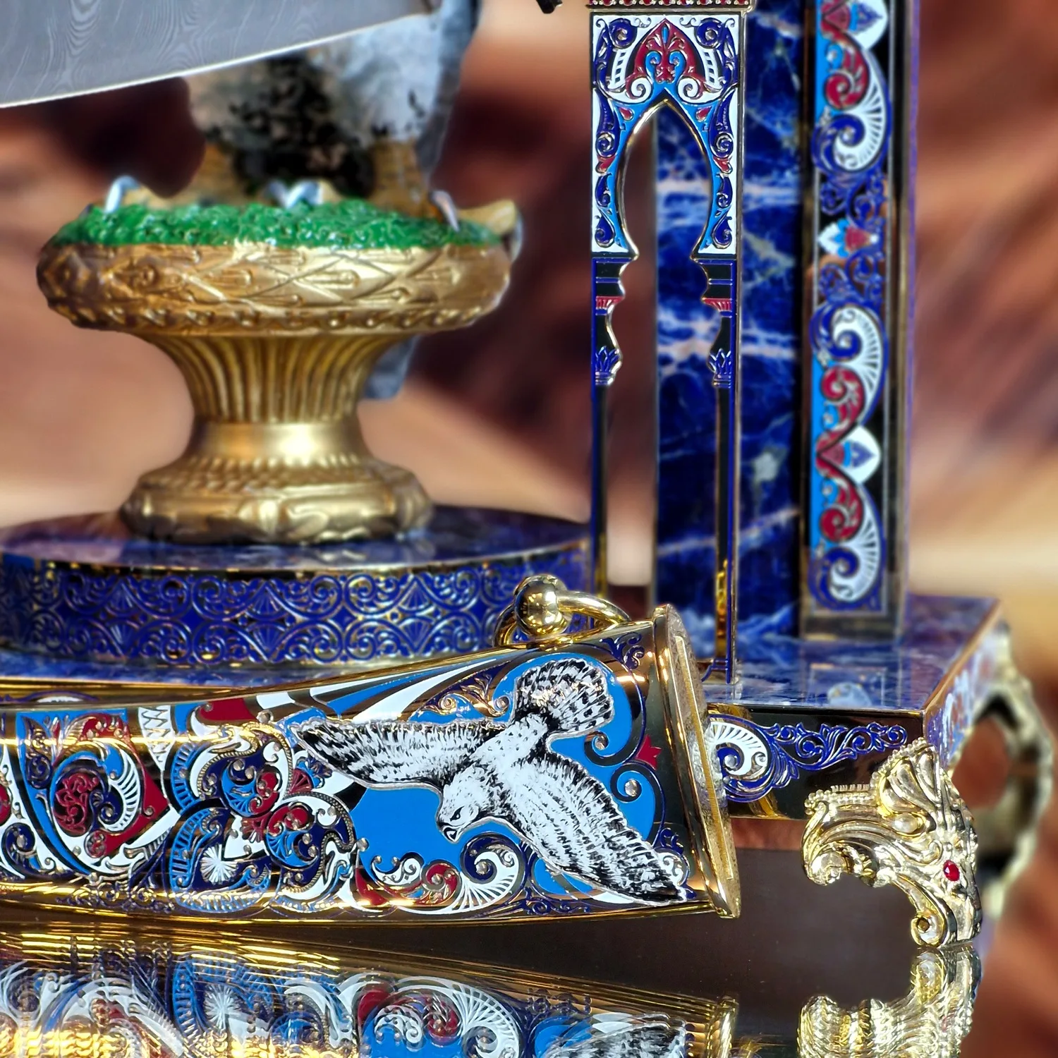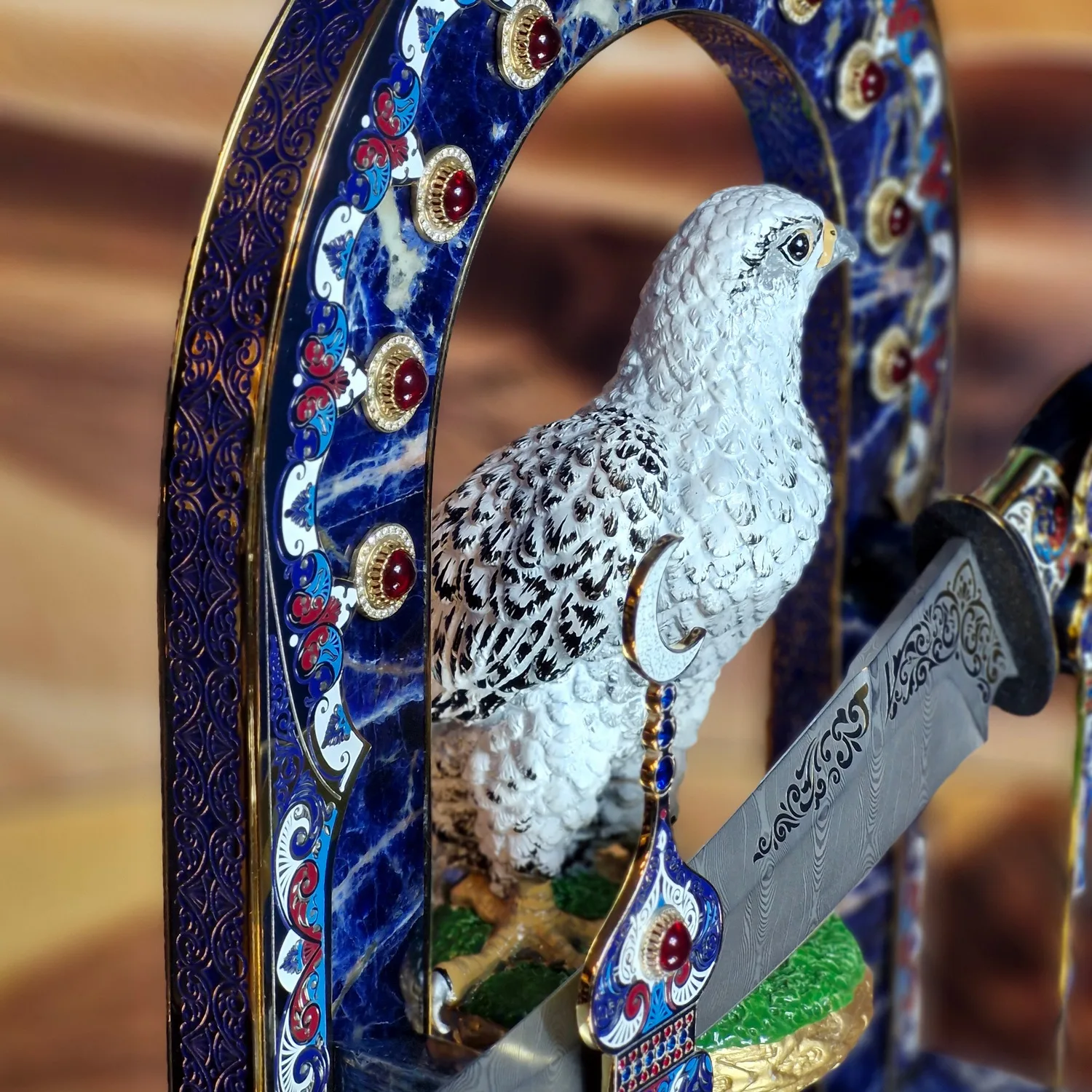 Эта работа создана для тех, кто ценит не оружие, а историю и статус, выраженные в металле, камне и цвете. Композиция естественно становится центром интерьера кабинета или гостиной, притягивая взгляды и вопросы гостей.