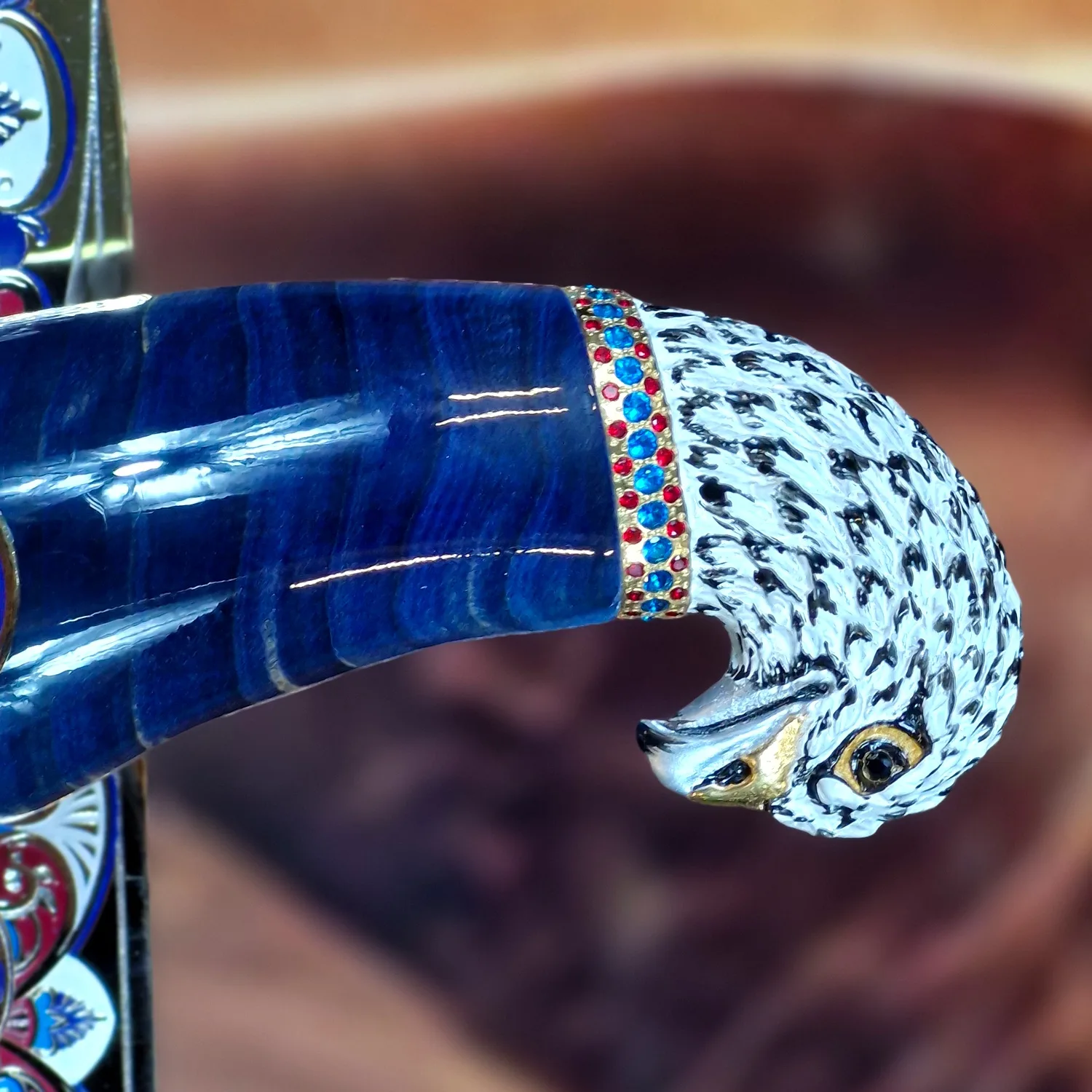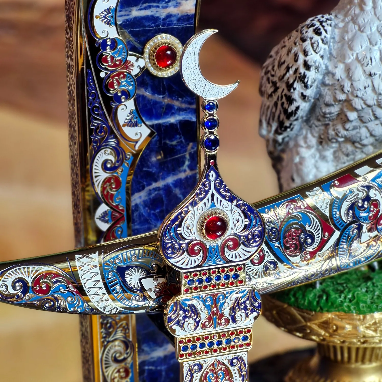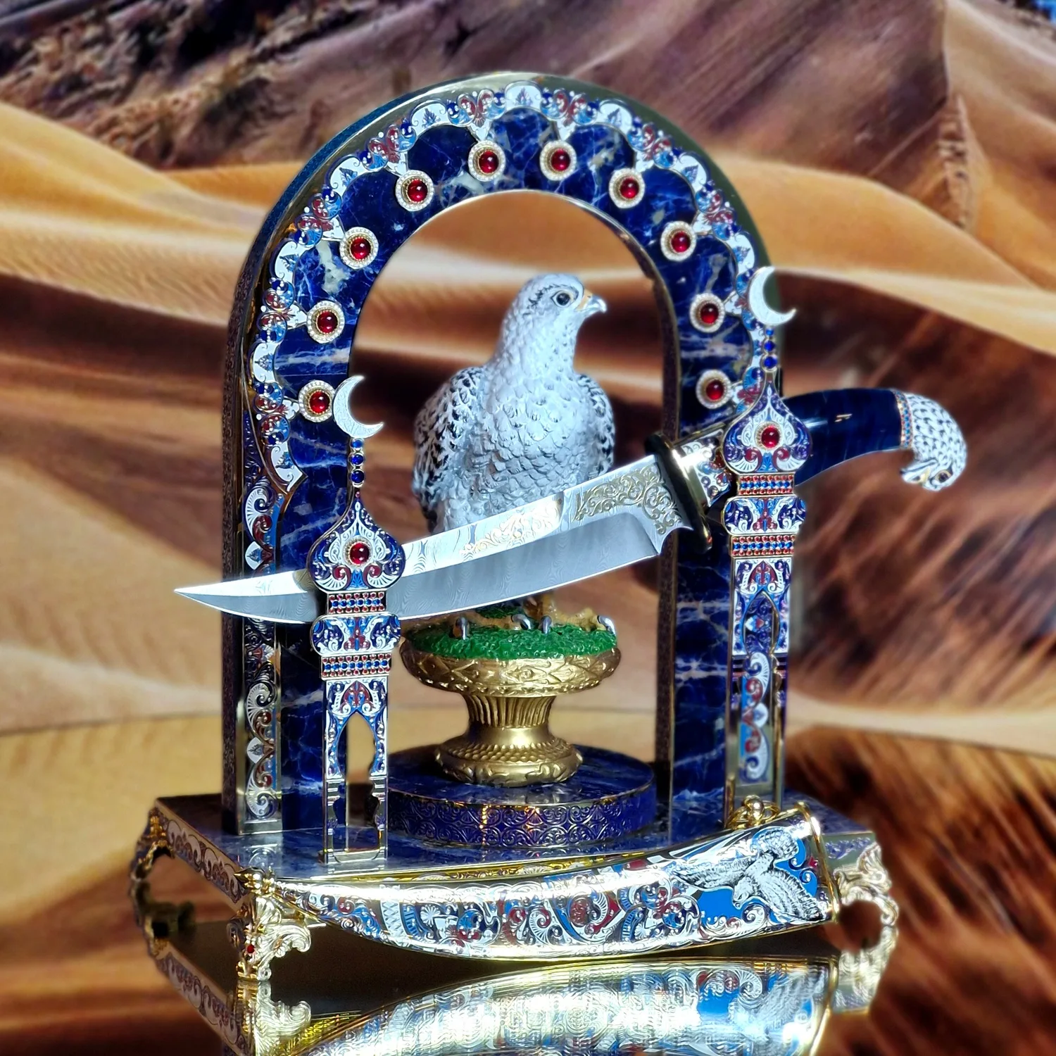 Нож, утопающий в эмали, камнях и тончайшей гравировке, выглядит как реликвия правителей, знакомая лишь избранным. Изогнутые линии клинка и ножен перекликаются с формой песчаных барханов, а серебристая рукоять напоминает о прохладе звёздной ночи, когда Сапфировый страж пустыни несёт свою незримую вахту.