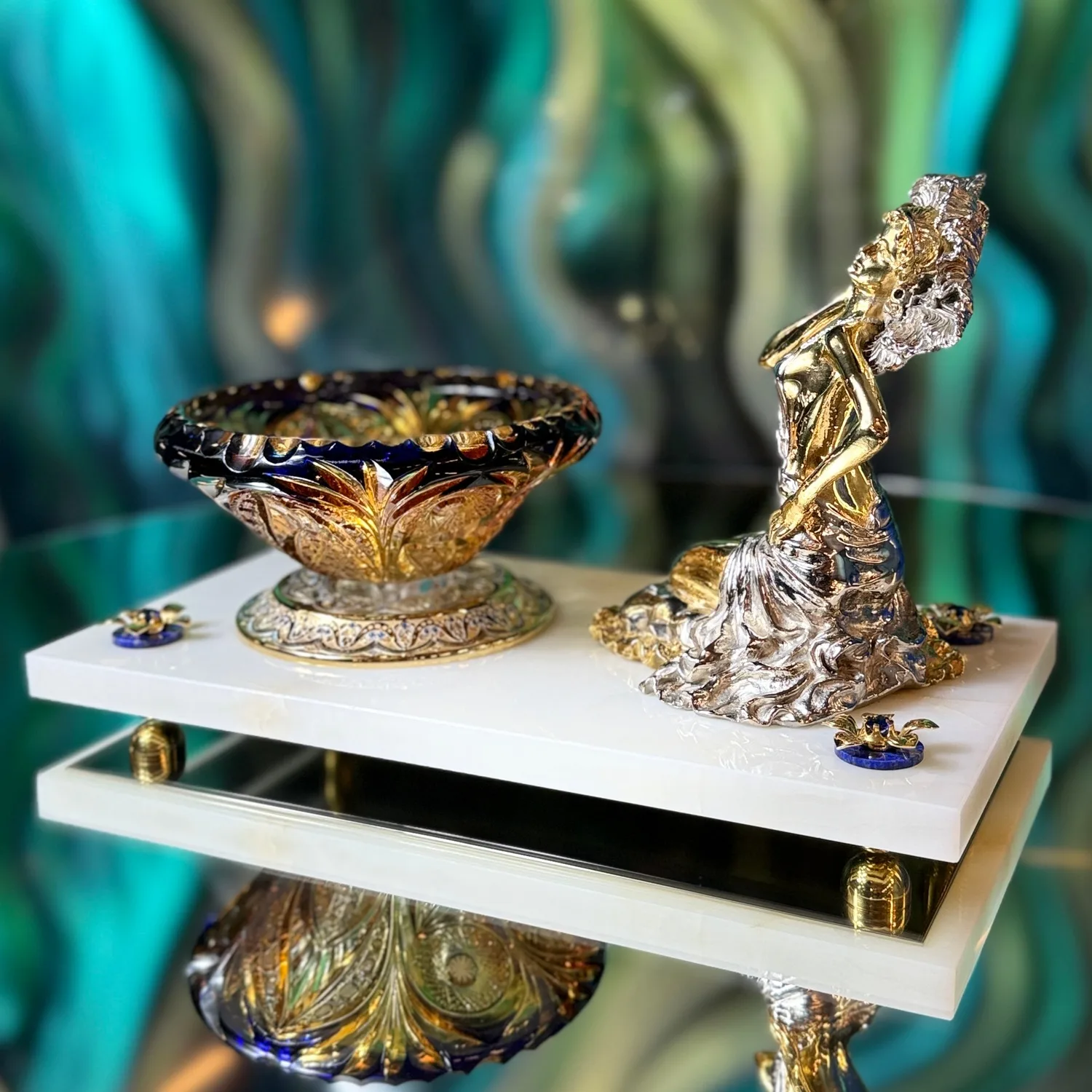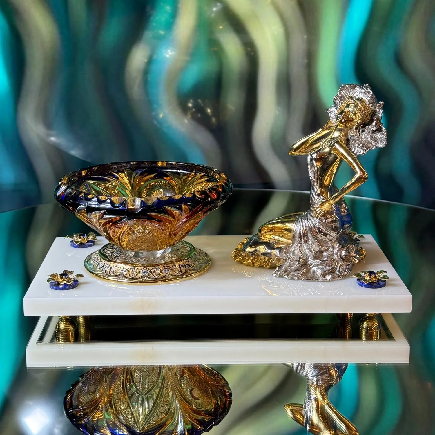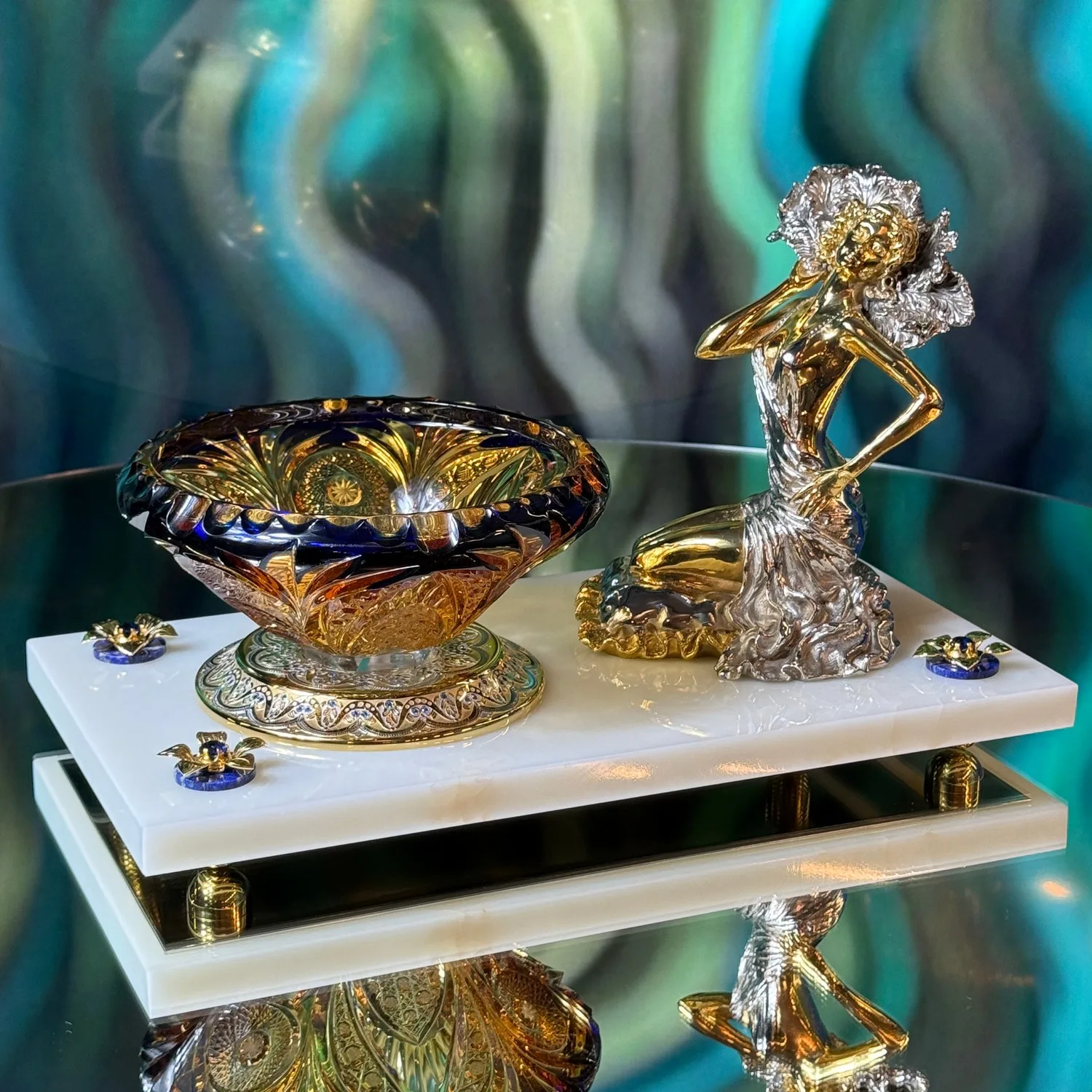 Сочетание холодного блеска хрусталя и теплого сияния металла создает потрясающую игру света и тени. Набор расположен на изящном мраморном постаменте, который подчеркивает роскошь и неповторимость.