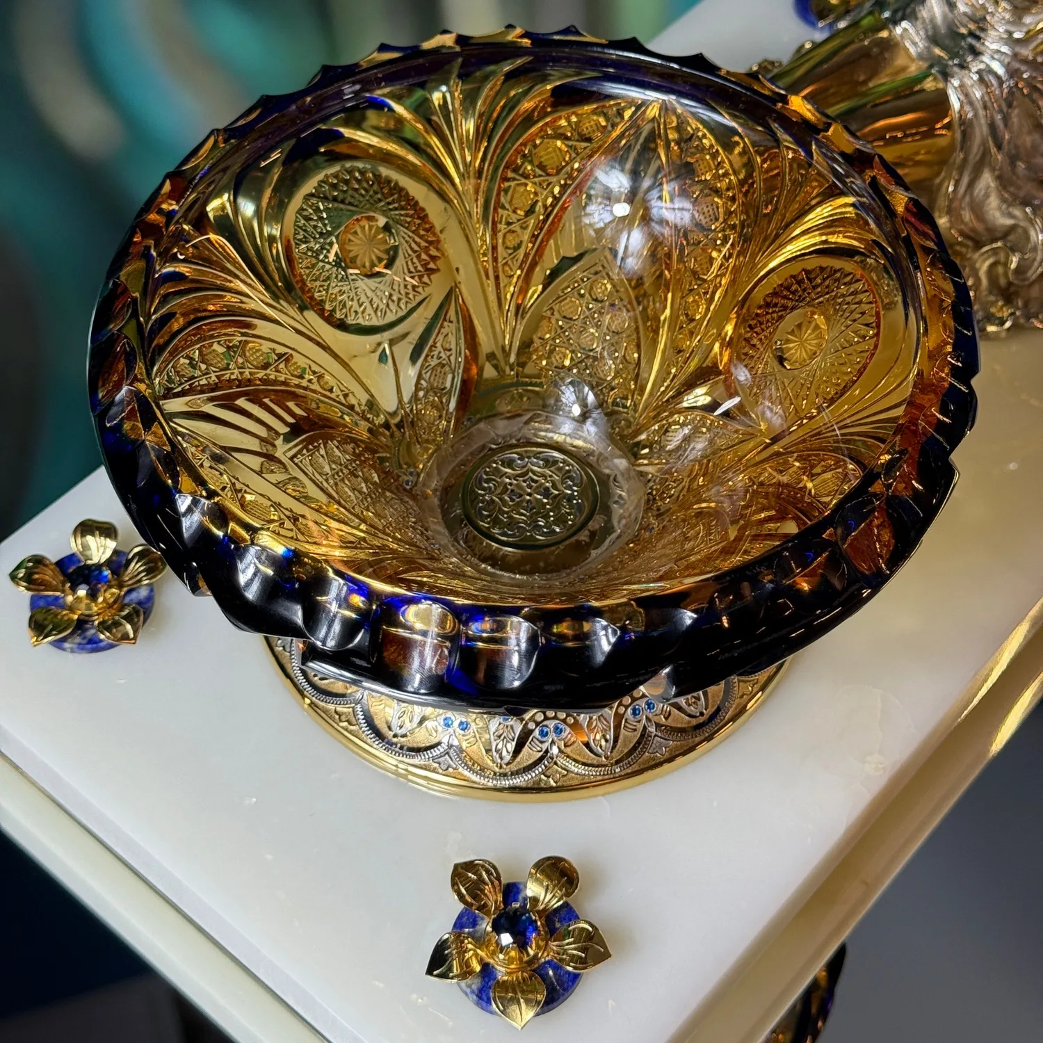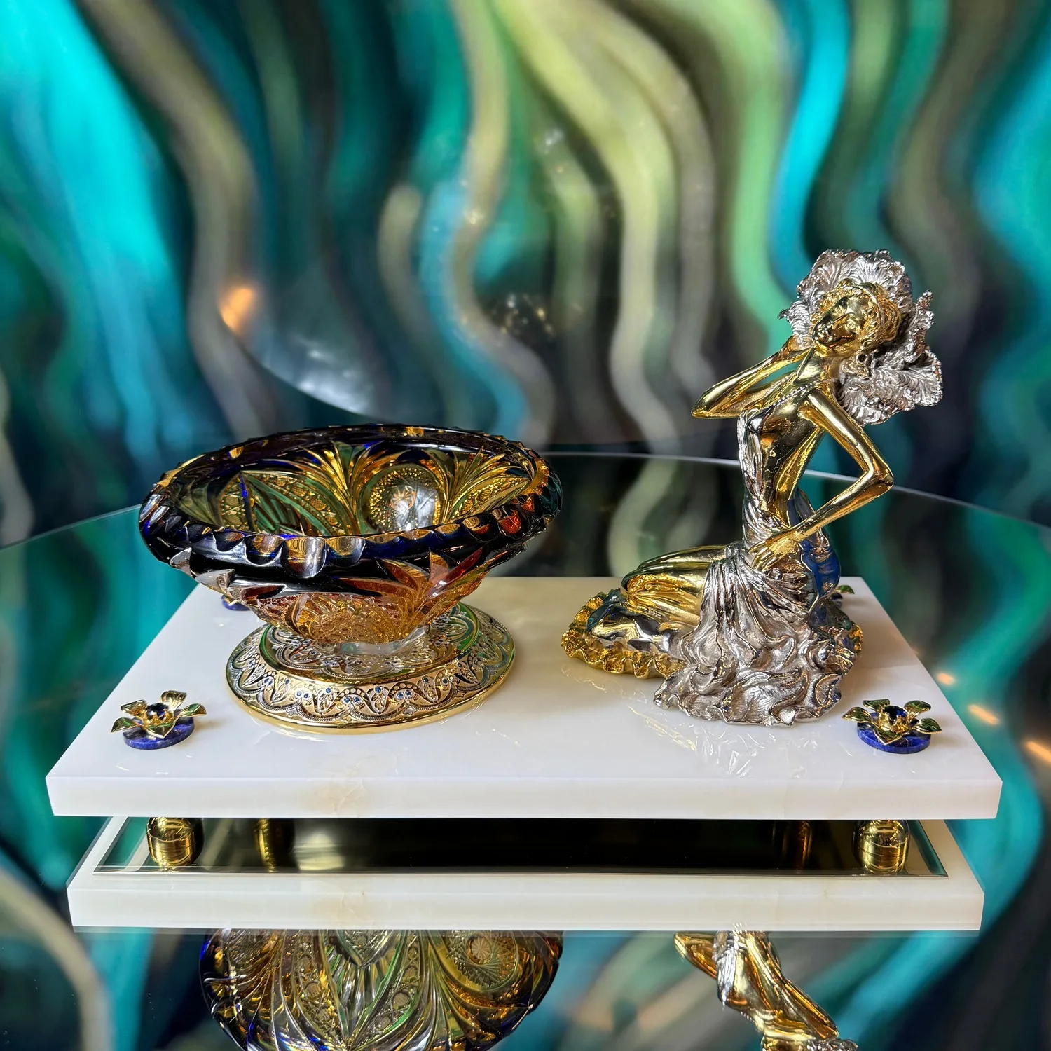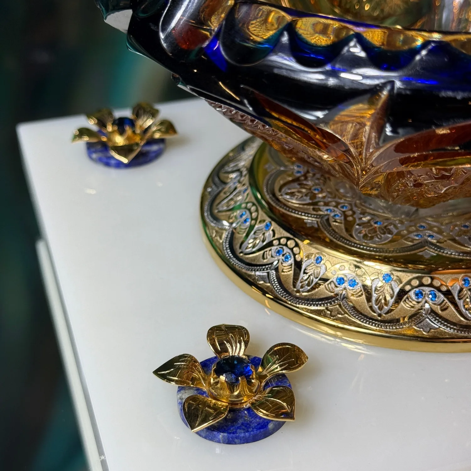 Сочетание холодного блеска хрусталя и теплого сияния металла создает потрясающую игру света и тени. Набор расположен на изящном мраморном постаменте, который подчеркивает роскошь и неповторимость.