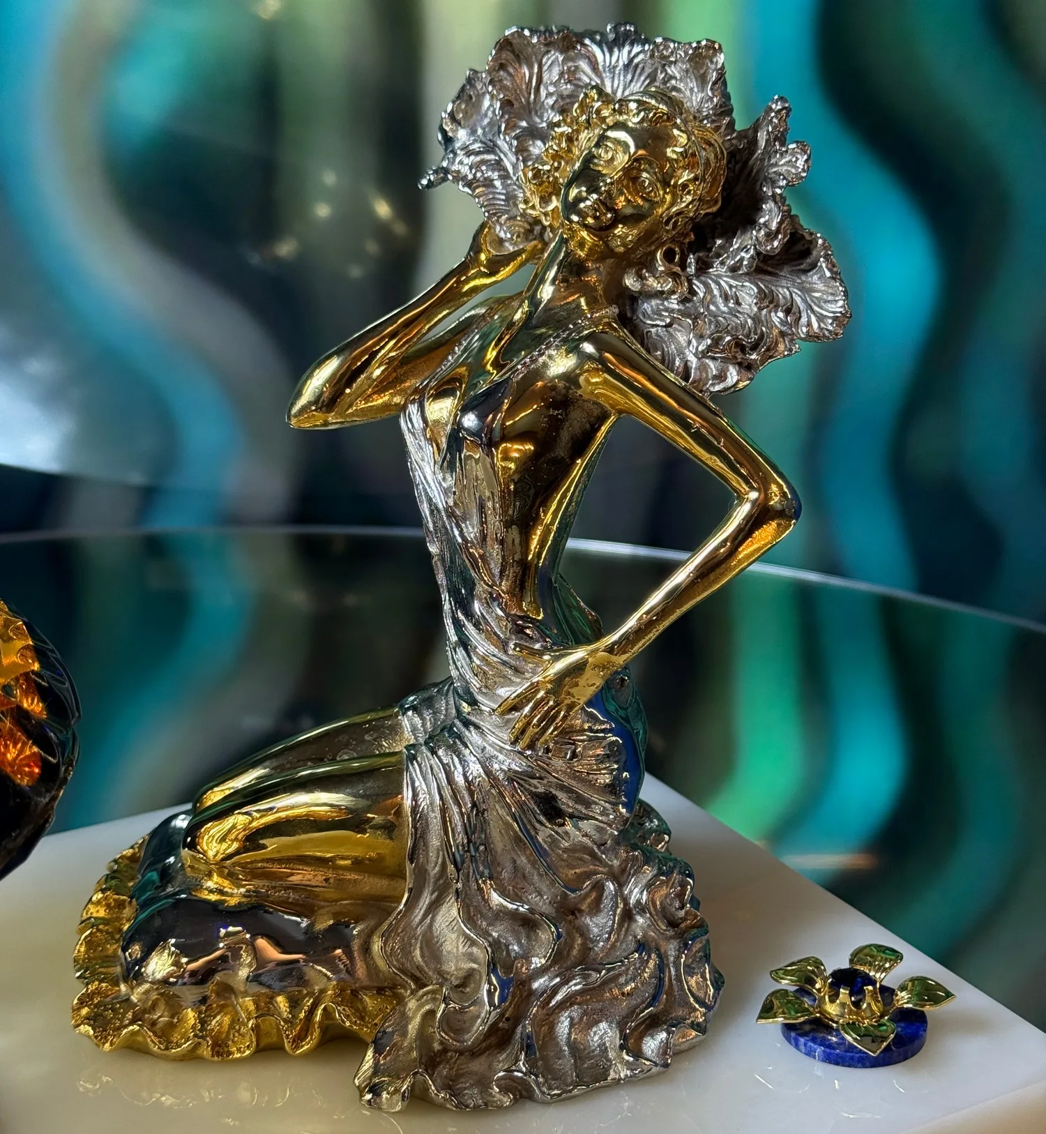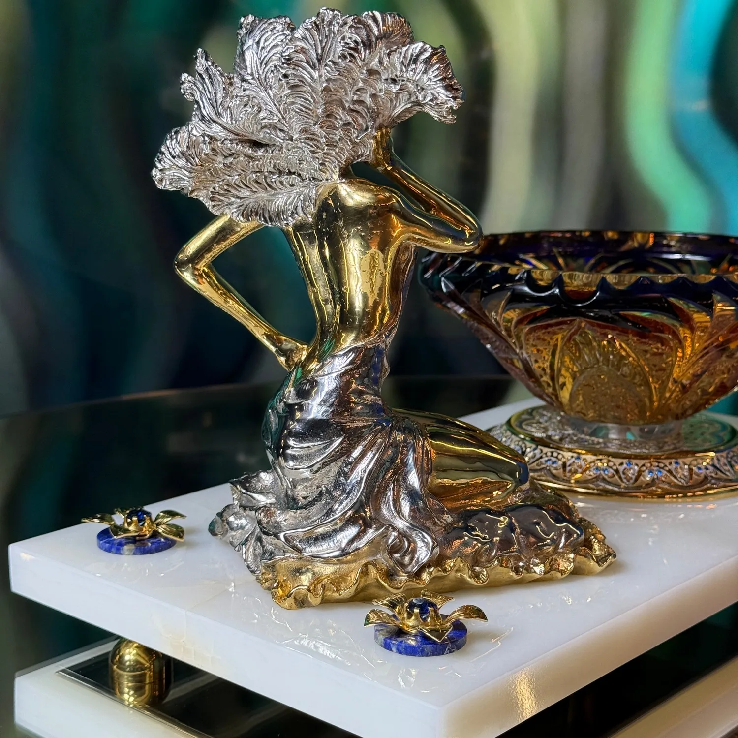 Женская фигурка, выполненная в благородных золотистых и серебристых тонах, излучает невероятную грацию и шарм. Её плавные линии идеально дополняются глубоким насыщенным синим цветом хрустального сосуда, украшенного замысловатым орнаментом.