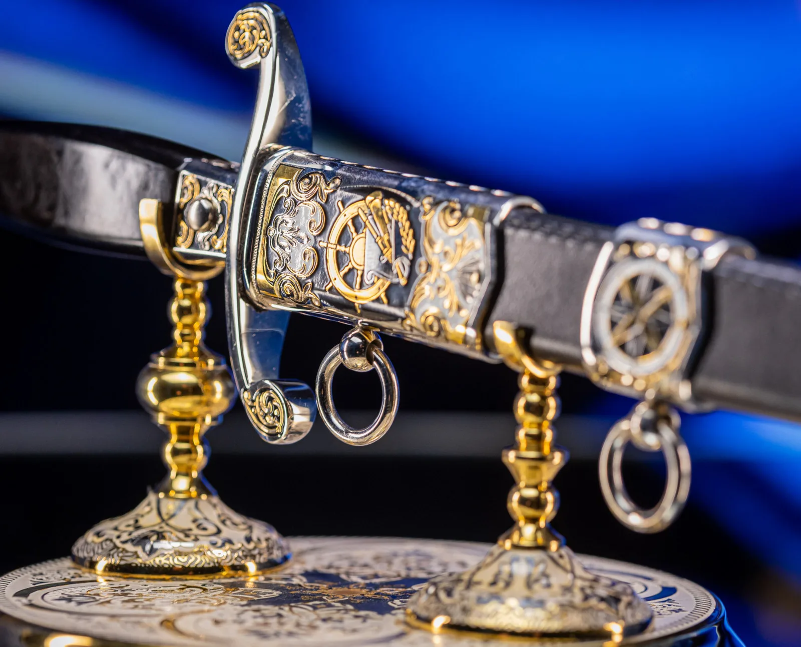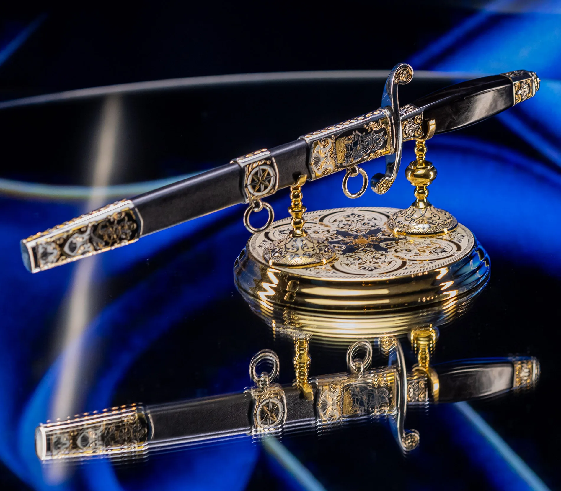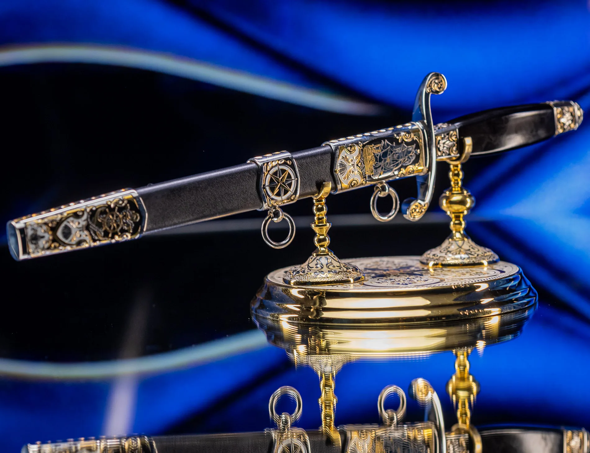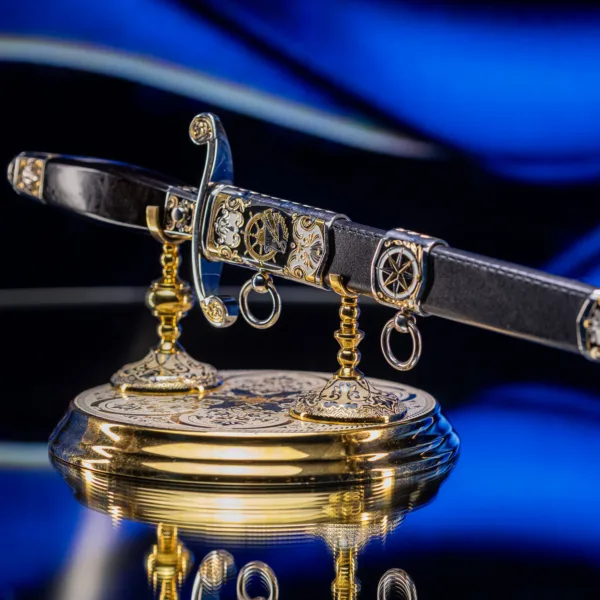 Символ высшего военно-морского достоинства, воплощающий вековые традиции флотской элиты. Изысканное оружие, которое носили командующие эскадрами и покорители океанов, чья воля определяла судьбы морских сражений и целых государств. Клинок выполнен из высококачественной стали с зеркальной полировкой, отражающей блики, подобно морской глади на рассвете. Рукоять украшена морской символикой: якоря, штурвалы, волны и геральдические элементы, искусно проработанные в золоте и серебре. Гарда декорирована изображением могучего корабля под полными парусами — метафора непоколебимой уверенности в курсе. Каждая деталь подчеркивает статус адмирала — человека, достигшего вершины военно-морской карьеры.