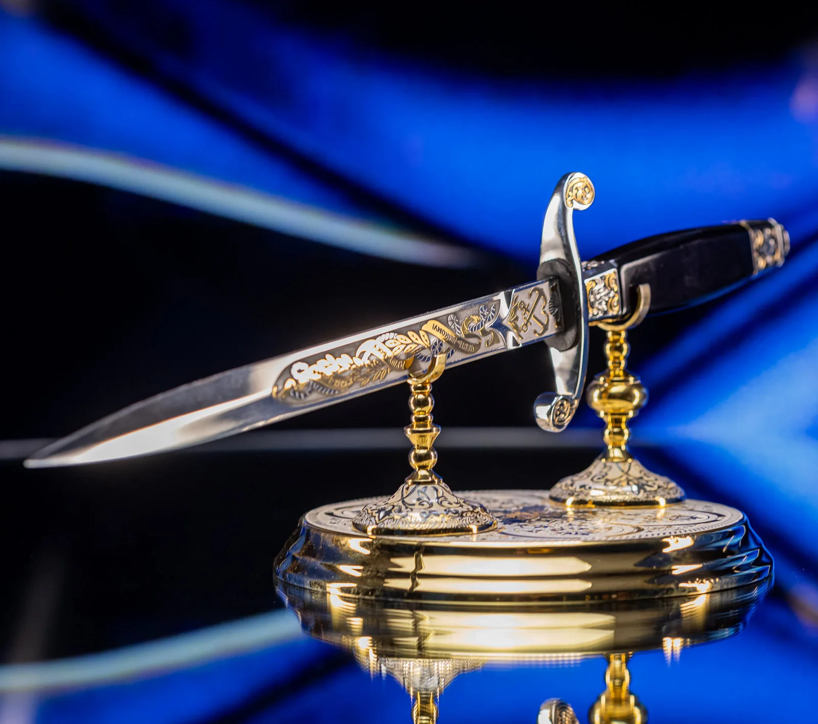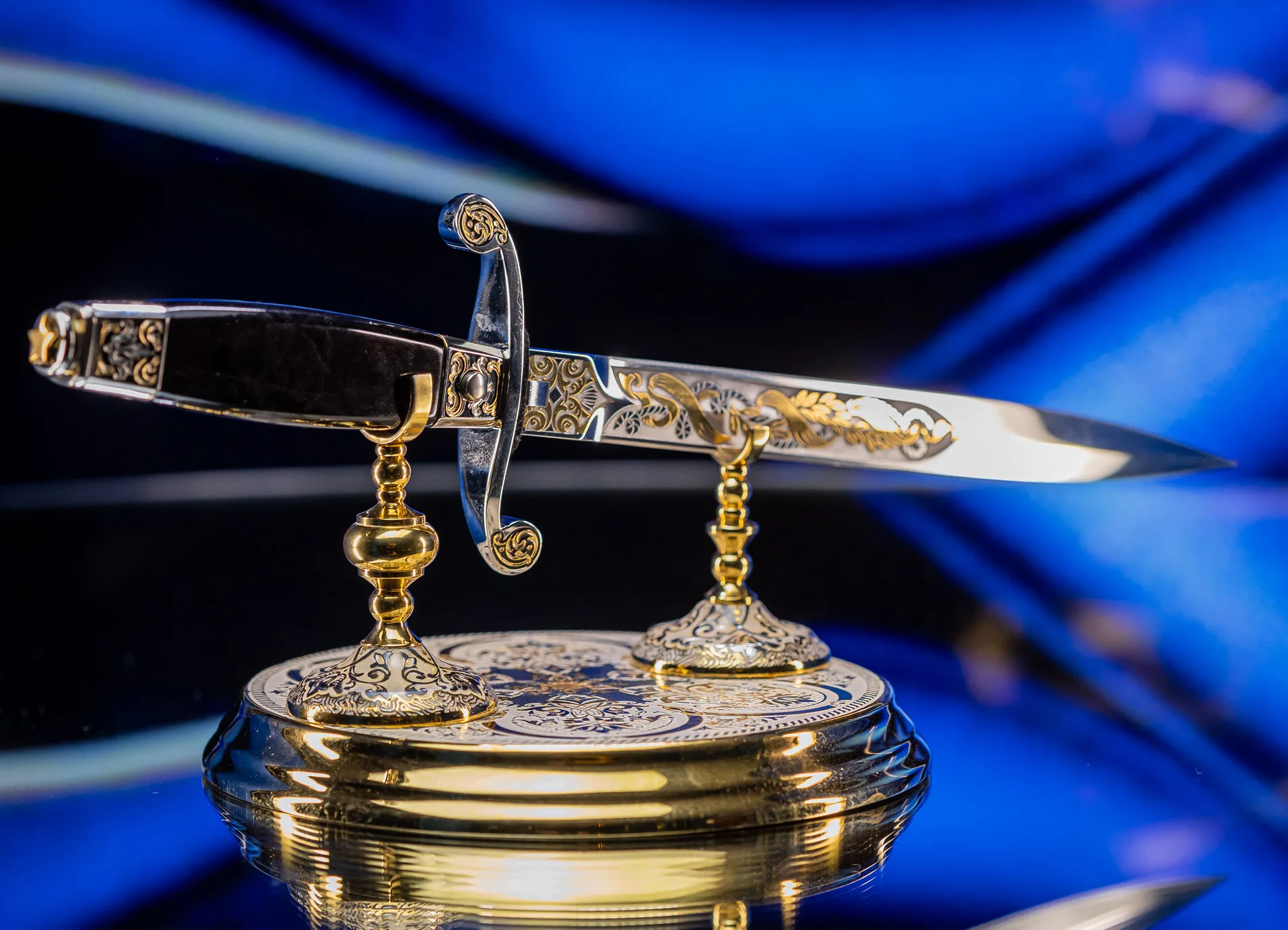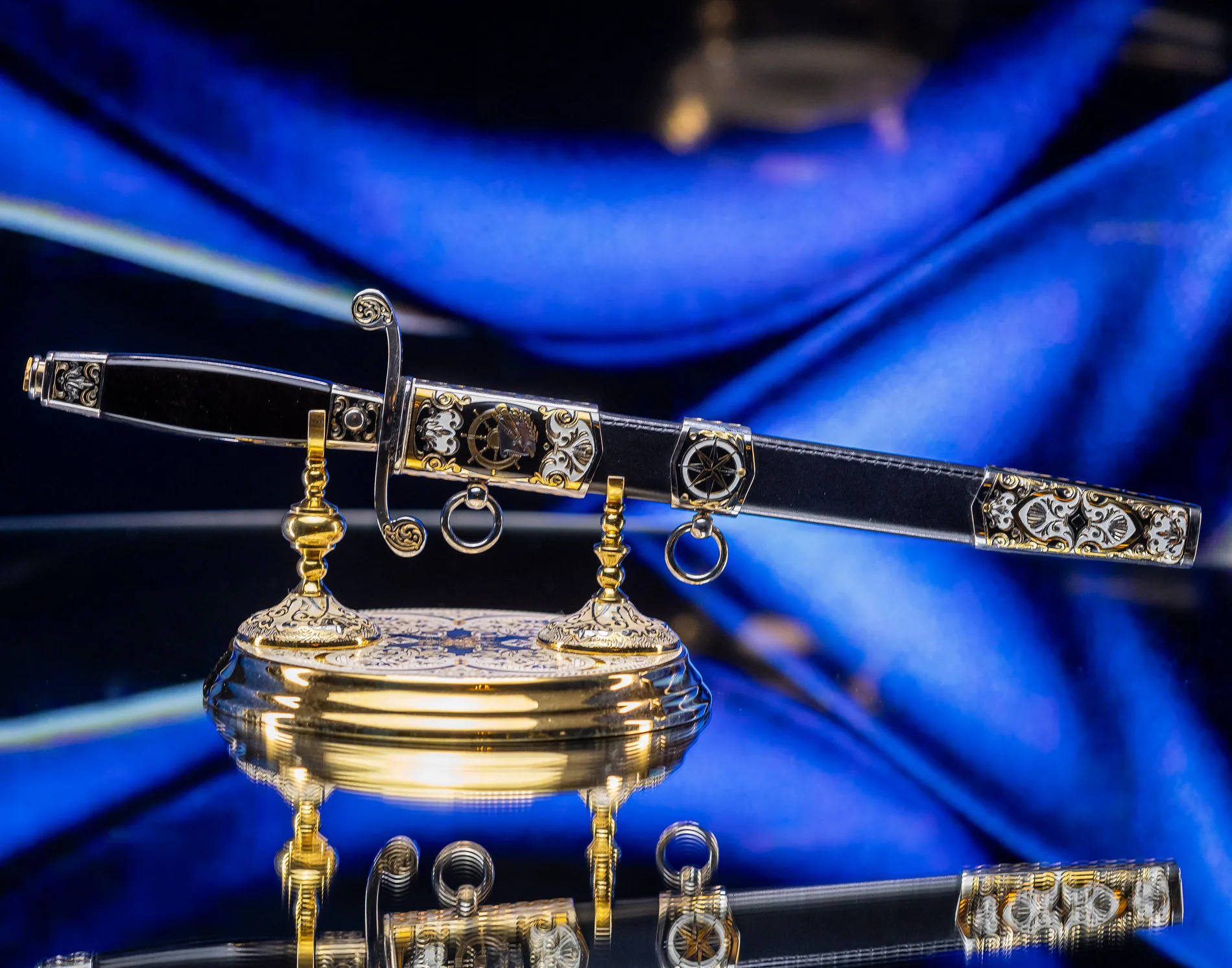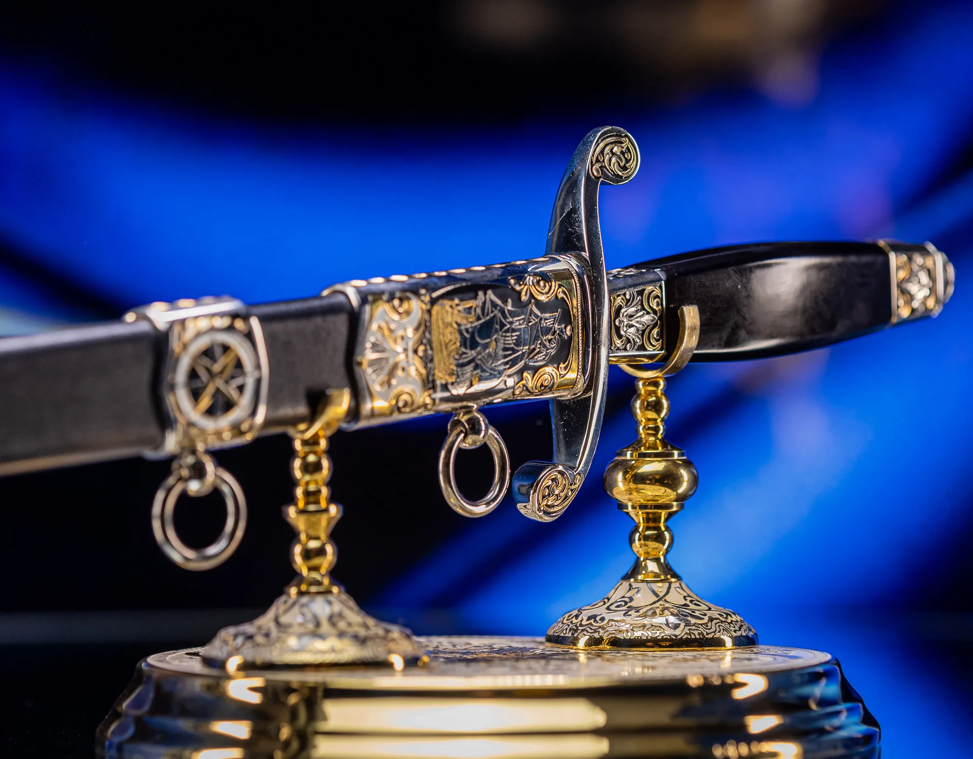 Символ высшего военно-морского достоинства, воплощающий вековые традиции флотской элиты. Изысканное оружие, которое носили командующие эскадрами и покорители океанов, чья воля определяла судьбы морских сражений и целых государств. Клинок выполнен из высококачественной стали с зеркальной полировкой, отражающей блики, подобно морской глади на рассвете. Рукоять украшена морской символикой: якоря, штурвалы, волны и геральдические элементы, искусно проработанные в золоте и серебре. Гарда декорирована изображением могучего корабля под полными парусами — метафора непоколебимой уверенности в курсе. Каждая деталь подчеркивает статус адмирала — человека, достигшего вершины военно-морской карьеры.