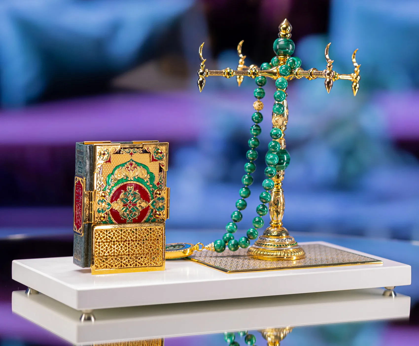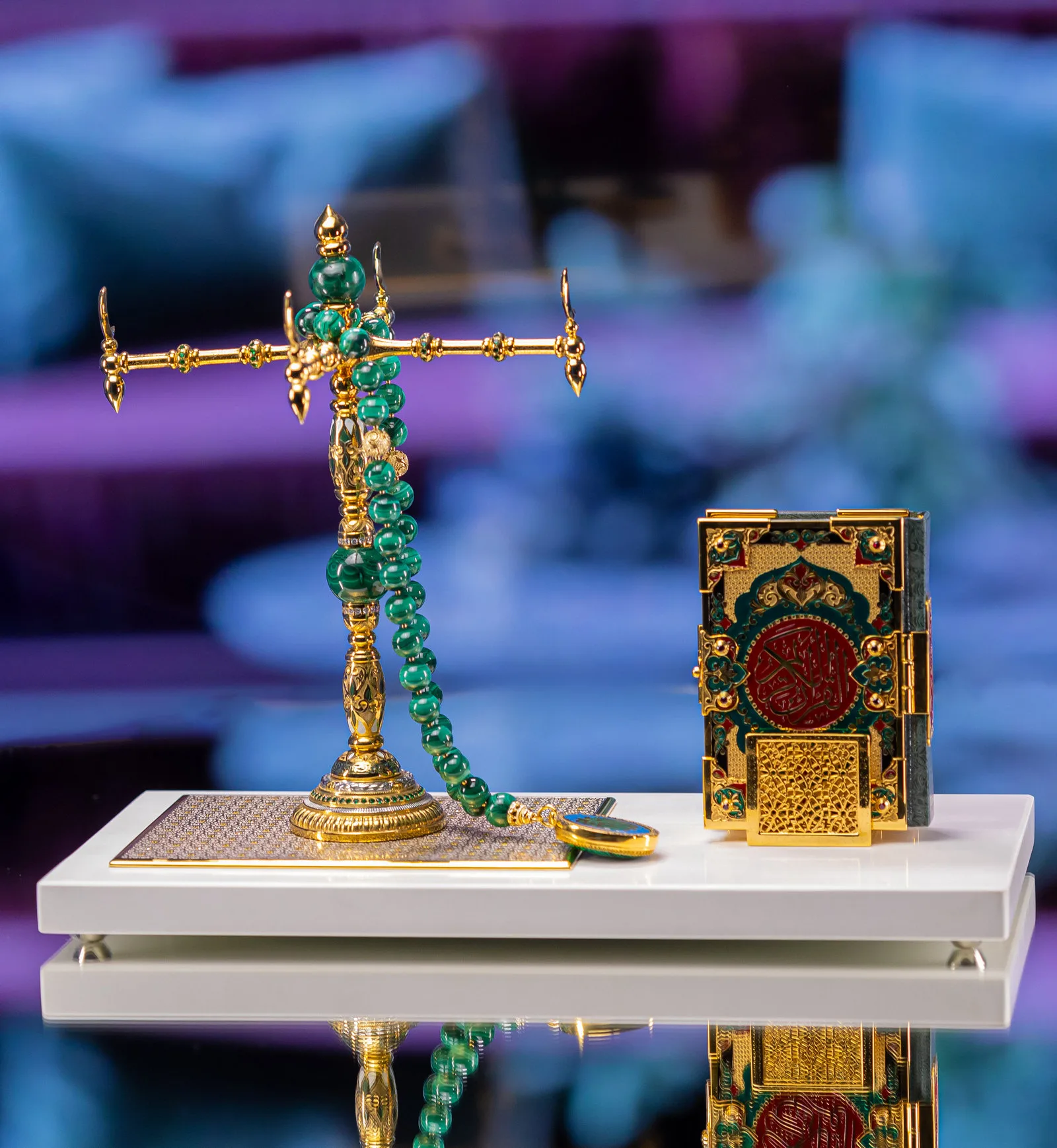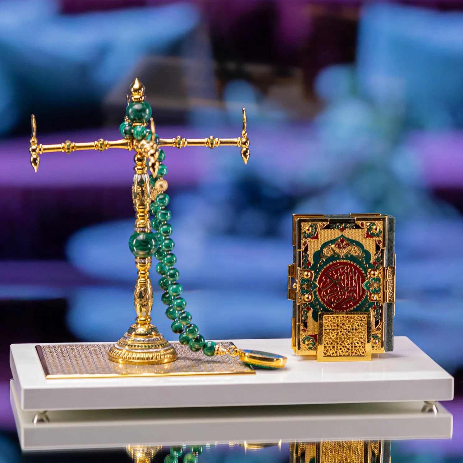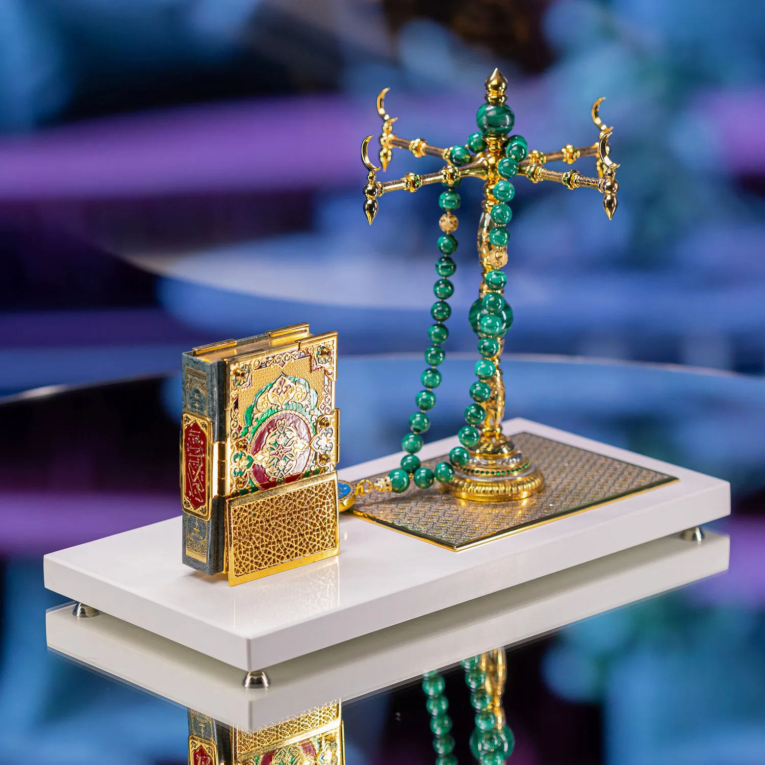 В сердце каждого дома должно быть место, где душа обретает покой и возвышается к небесам. Настольная композиция воплощает древнюю мудрость Востока, где каждая деталь наполнена глубоким смыслом и благословением. Изящные четки из благородного малахита — камня, который веками почитался как талисман духовной защиты и просветления. Зеленые оттенки малахита напоминают о райских садах, где текут реки милосердия, а каждая бусина четок становится ступенью на пути к божественному свету. Белоснежный мрамор служит основанием композиции, символизируя чистоту помыслов и незыблемость веры. Подобно горным вершинам, устремленным к небу, мрамор олицетворяет стойкость духа и благородство намерений. Золотое сияние элементов перекликается с сокровищами мудрости, накопленными поколениями. Драгоценная книга рядом хранит священные письмена, а четки приглашают к ежедневной молитве и размышлению.