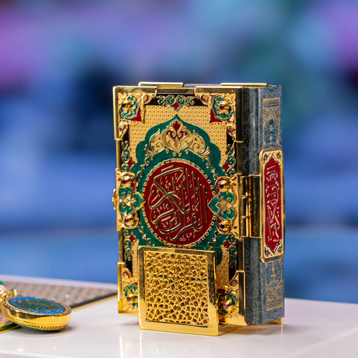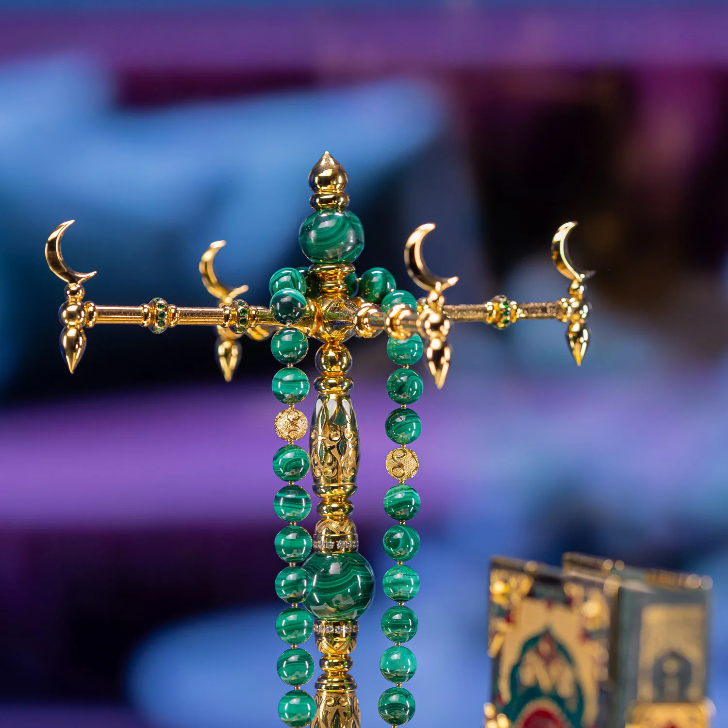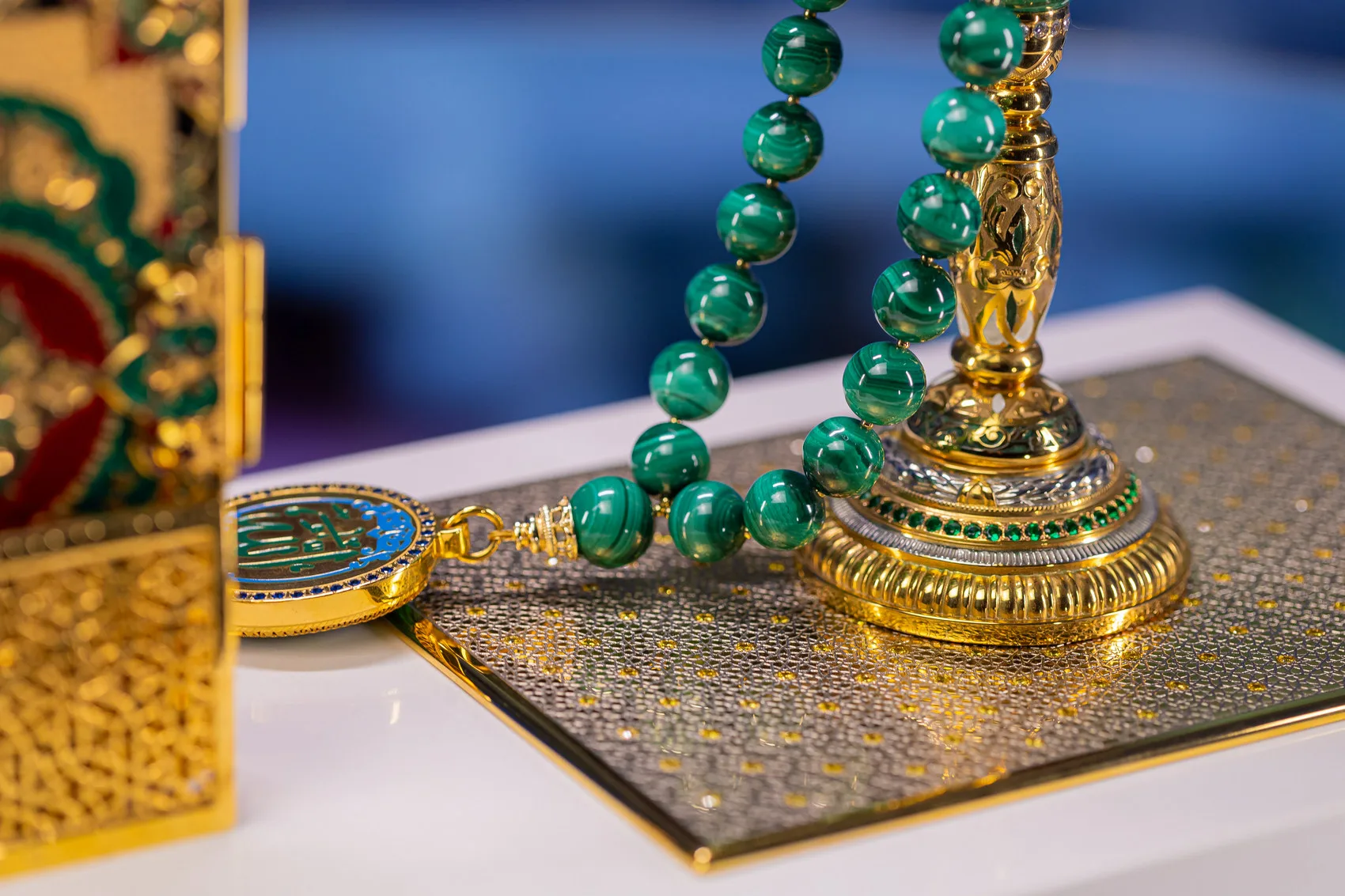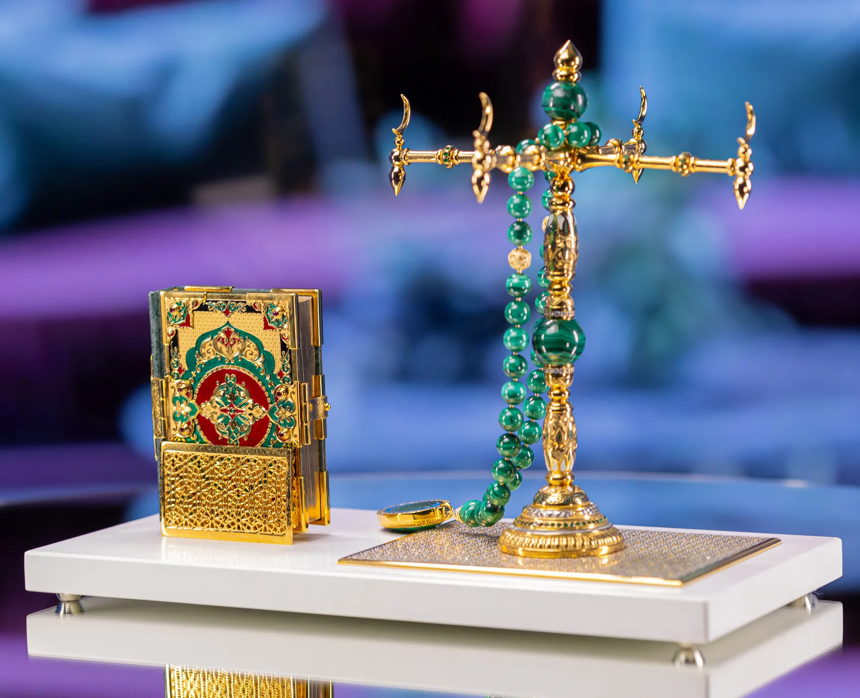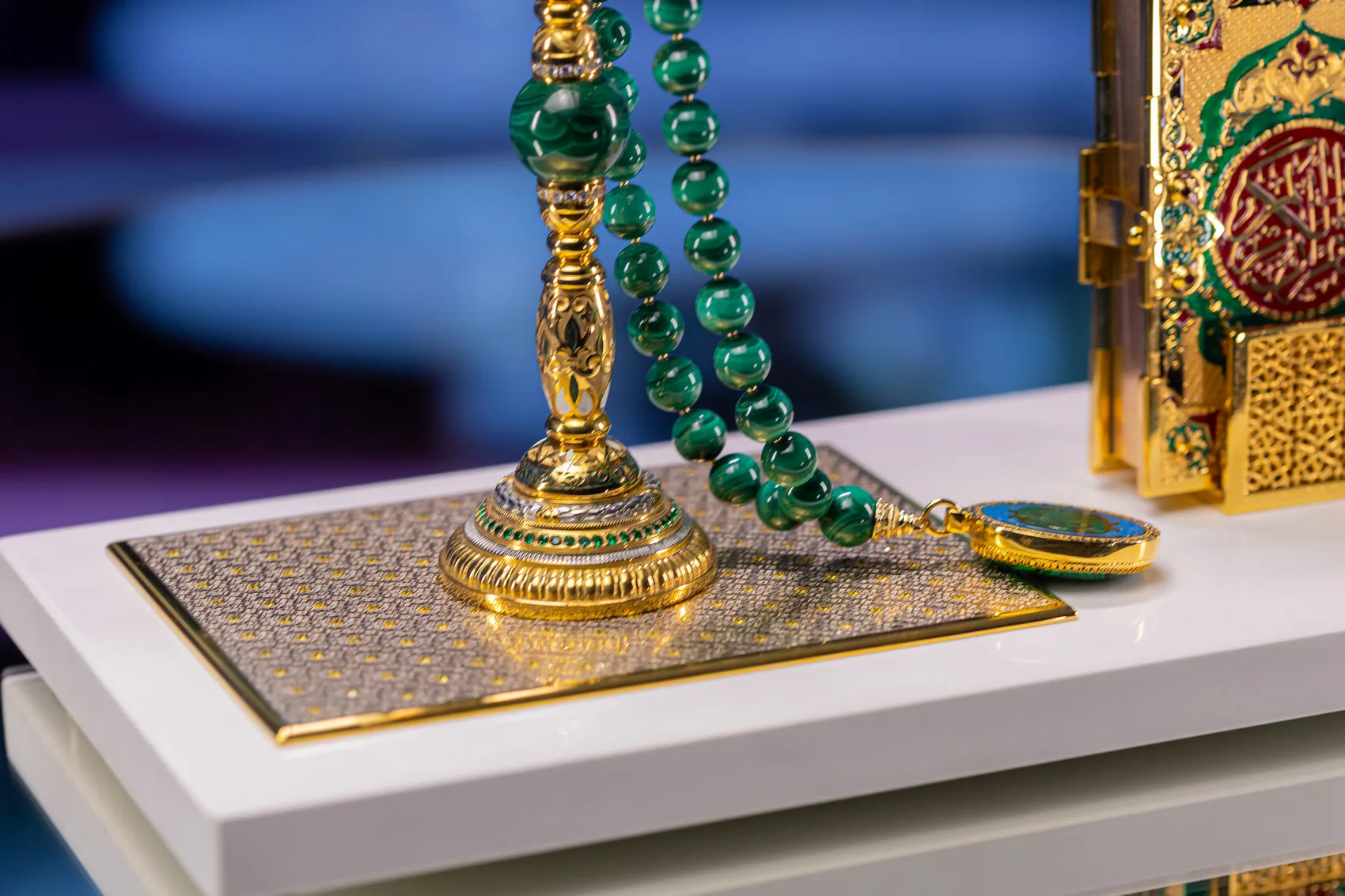 В сердце каждого дома должно быть место, где душа обретает покой и возвышается к небесам. Настольная композиция воплощает древнюю мудрость Востока, где каждая деталь наполнена глубоким смыслом и благословением. Изящные четки из благородного малахита — камня, который веками почитался как талисман духовной защиты и просветления. Зеленые оттенки малахита напоминают о райских садах, где текут реки милосердия, а каждая бусина четок становится ступенью на пути к божественному свету. Белоснежный мрамор служит основанием композиции, символизируя чистоту помыслов и незыблемость веры. Подобно горным вершинам, устремленным к небу, мрамор олицетворяет стойкость духа и благородство намерений. Золотое сияние элементов перекликается с сокровищами мудрости, накопленными поколениями. Драгоценная книга рядом хранит священные письмена, а четки приглашают к ежедневной молитве и размышлению.