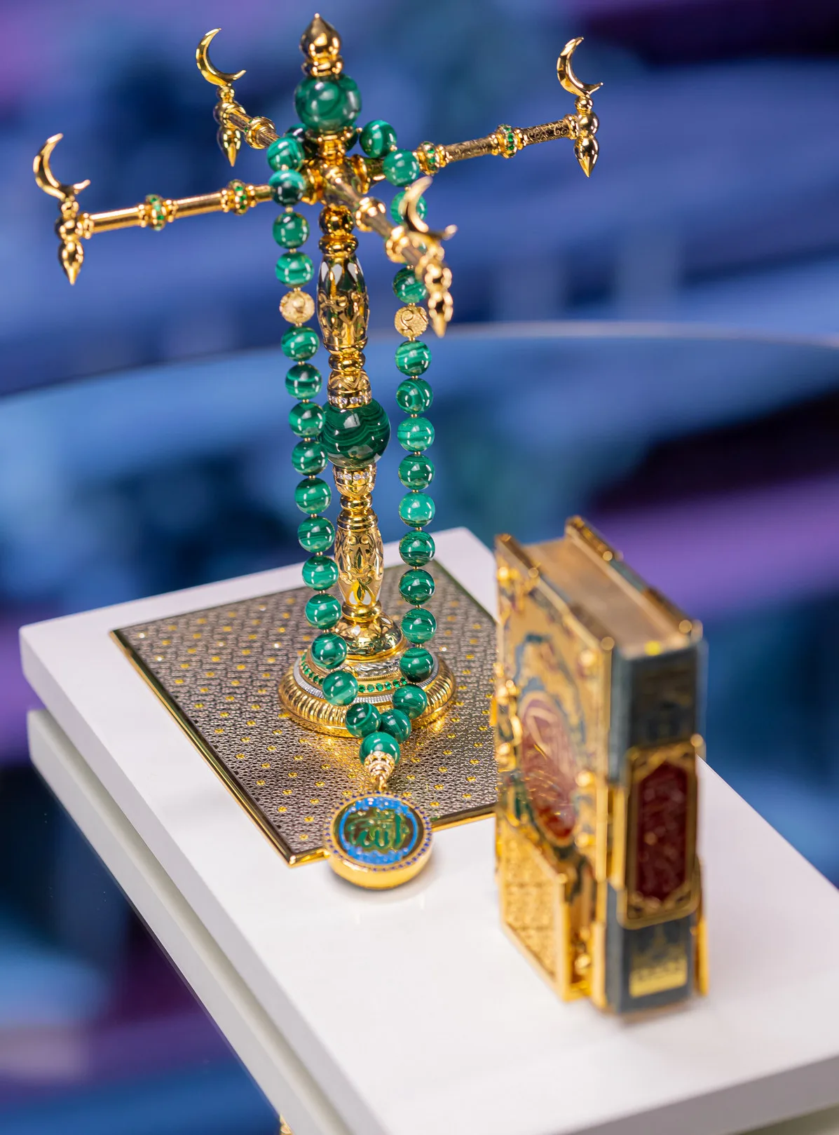 - Материалы: ювелирная латунь, белый мрамор, золото, эмали, фианиты , малахит (четки)