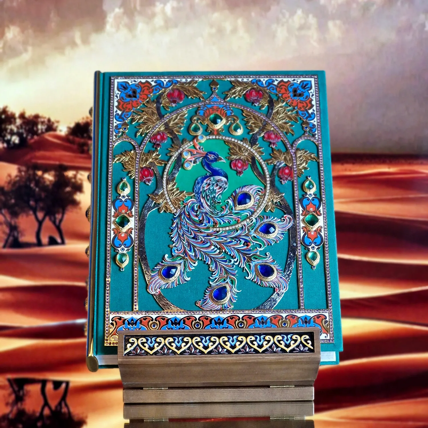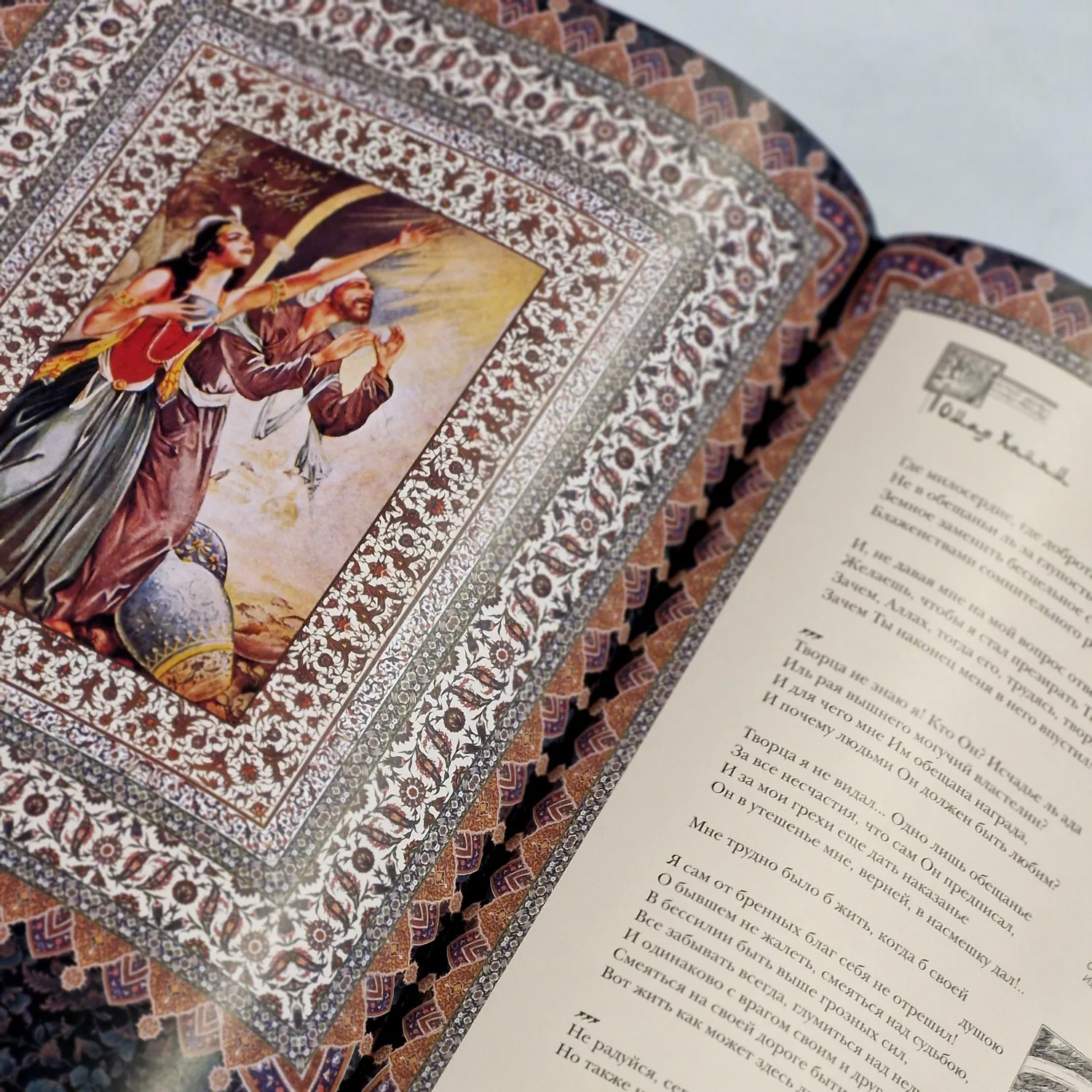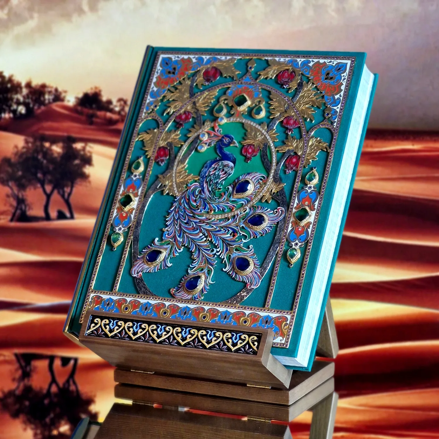 Каждая деталь — будь то искусный рельеф или сияющий кристалл — гармонично дополняет общее впечатление этого великолепного произведения. Элегантная подставка из благородного дерева превращает книгу в не просто предмет литературы, а в символ вечной мудрости и непреходящих истин. Листая её страницы, вы прикоснетесь к вековым размышлениям о жизни, времени и любви.