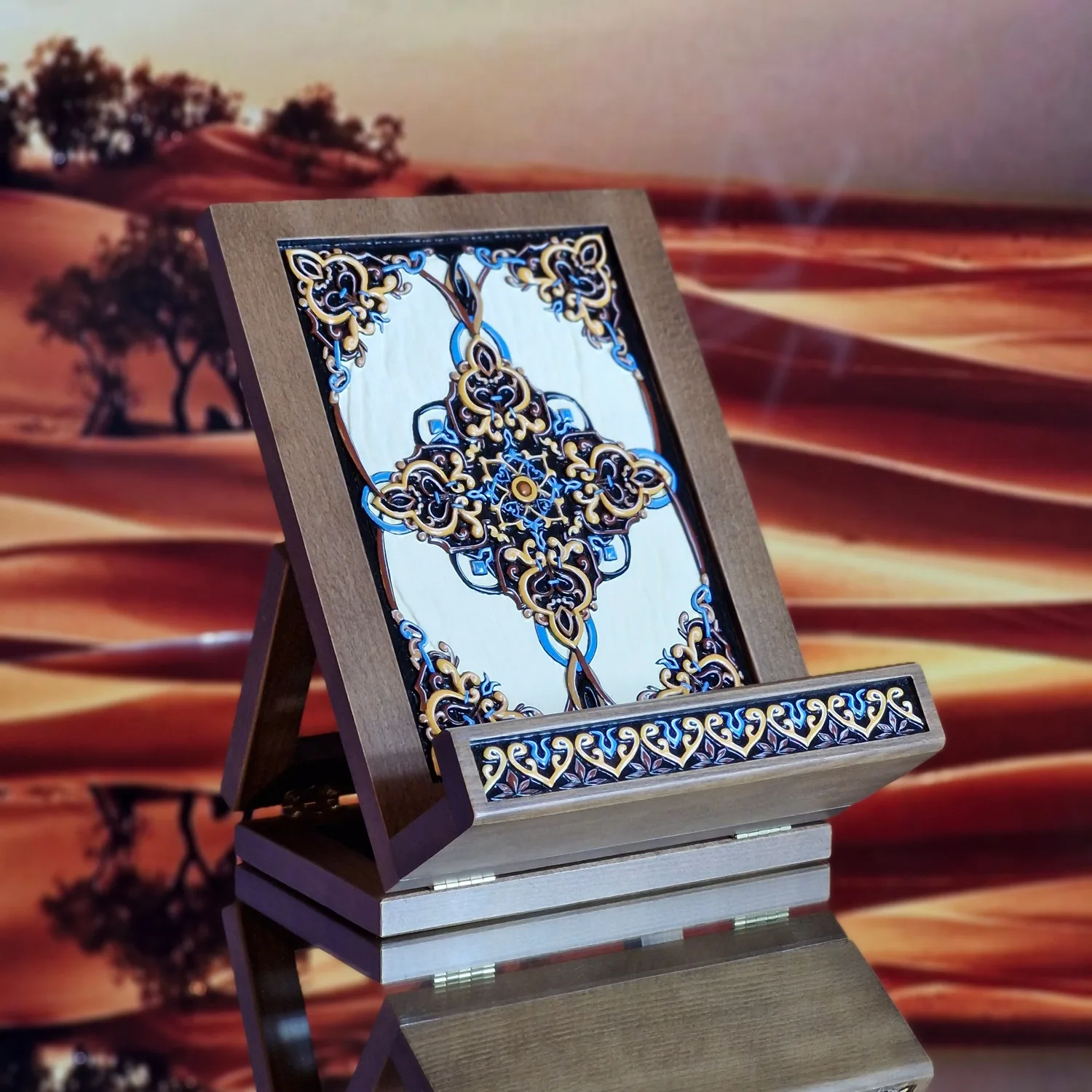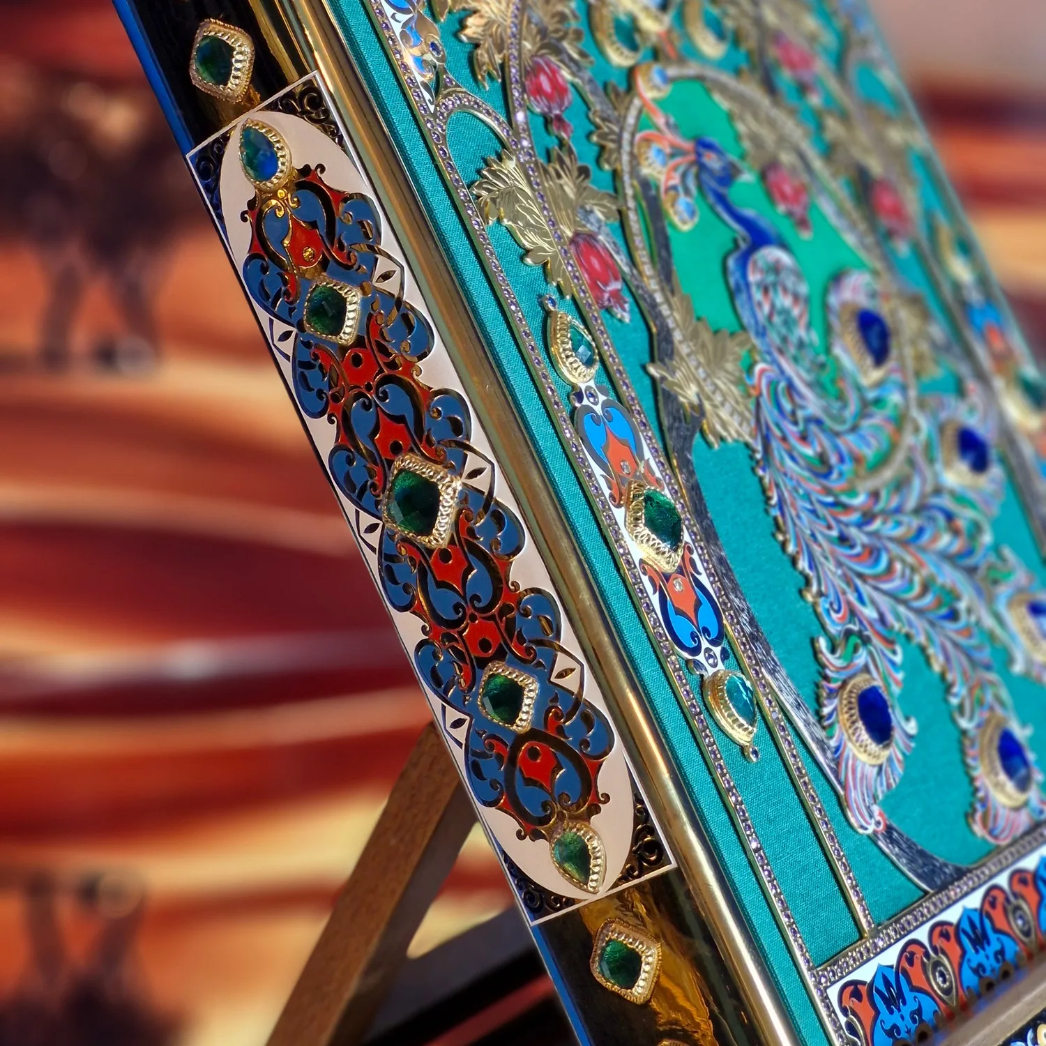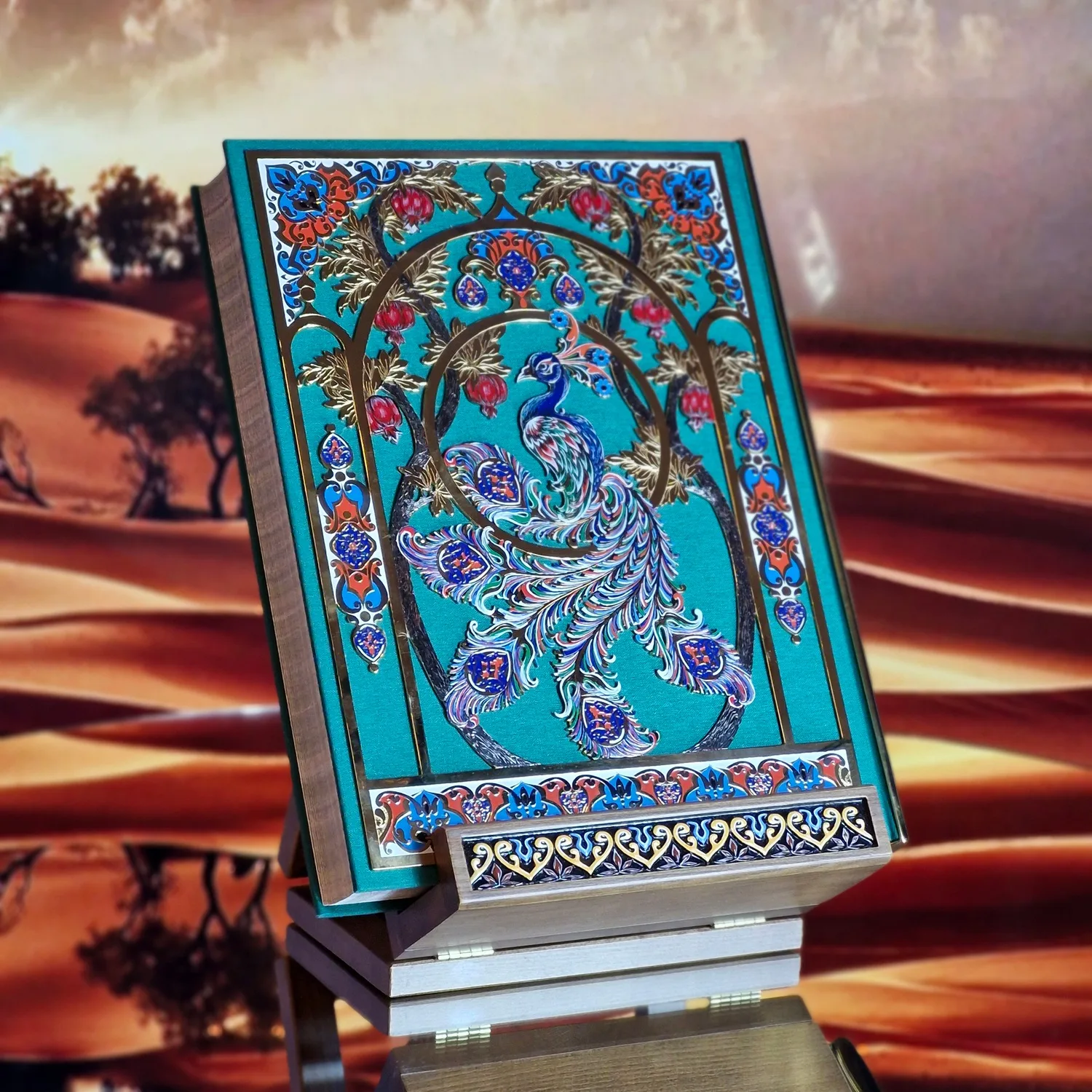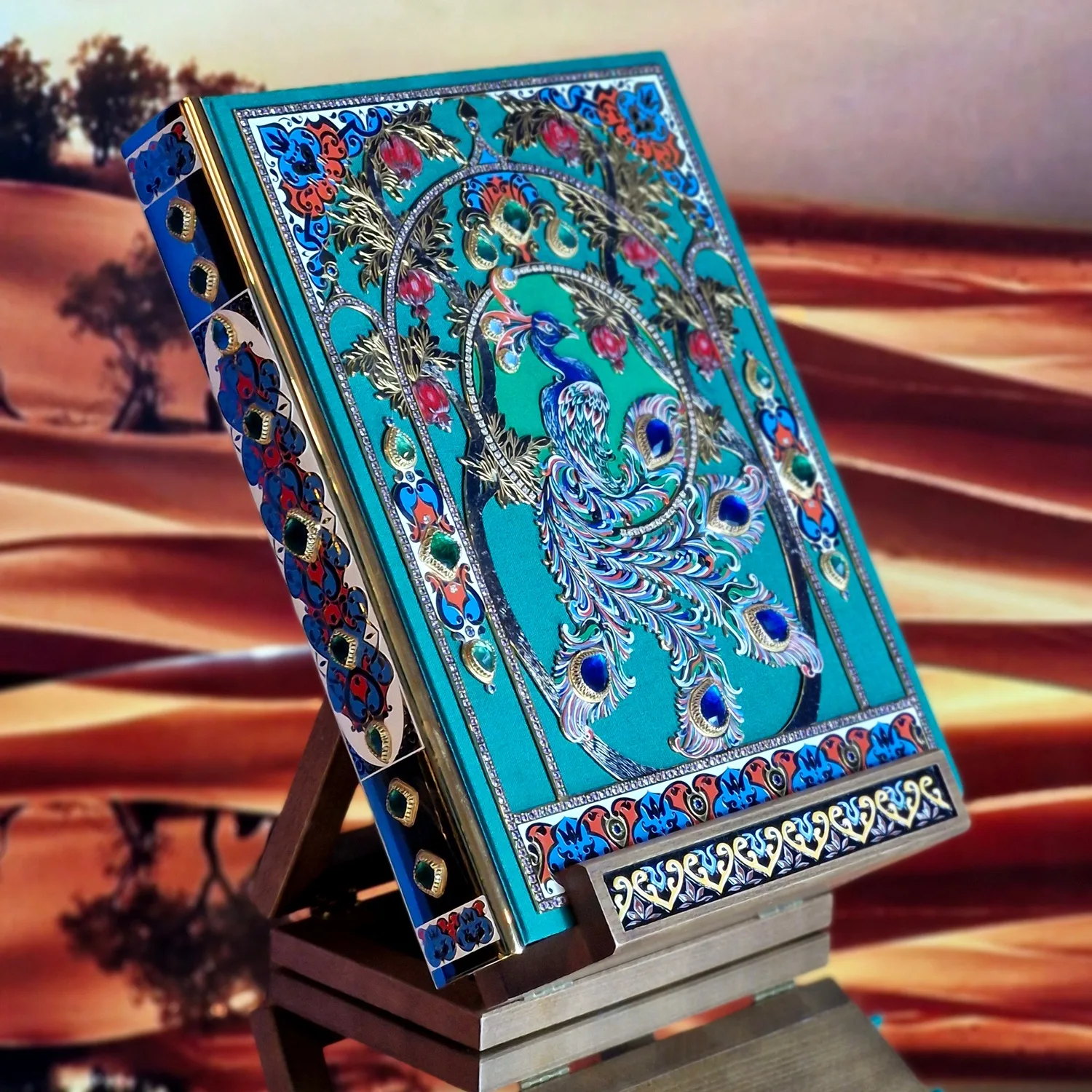 Каждая деталь — будь то искусный рельеф или сияющий кристалл — гармонично дополняет общее впечатление этого великолепного произведения. Элегантная подставка из благородного дерева превращает книгу в не просто предмет литературы, а в символ вечной мудрости и непреходящих истин. Листая её страницы, вы прикоснетесь к вековым размышлениям о жизни, времени и любви.