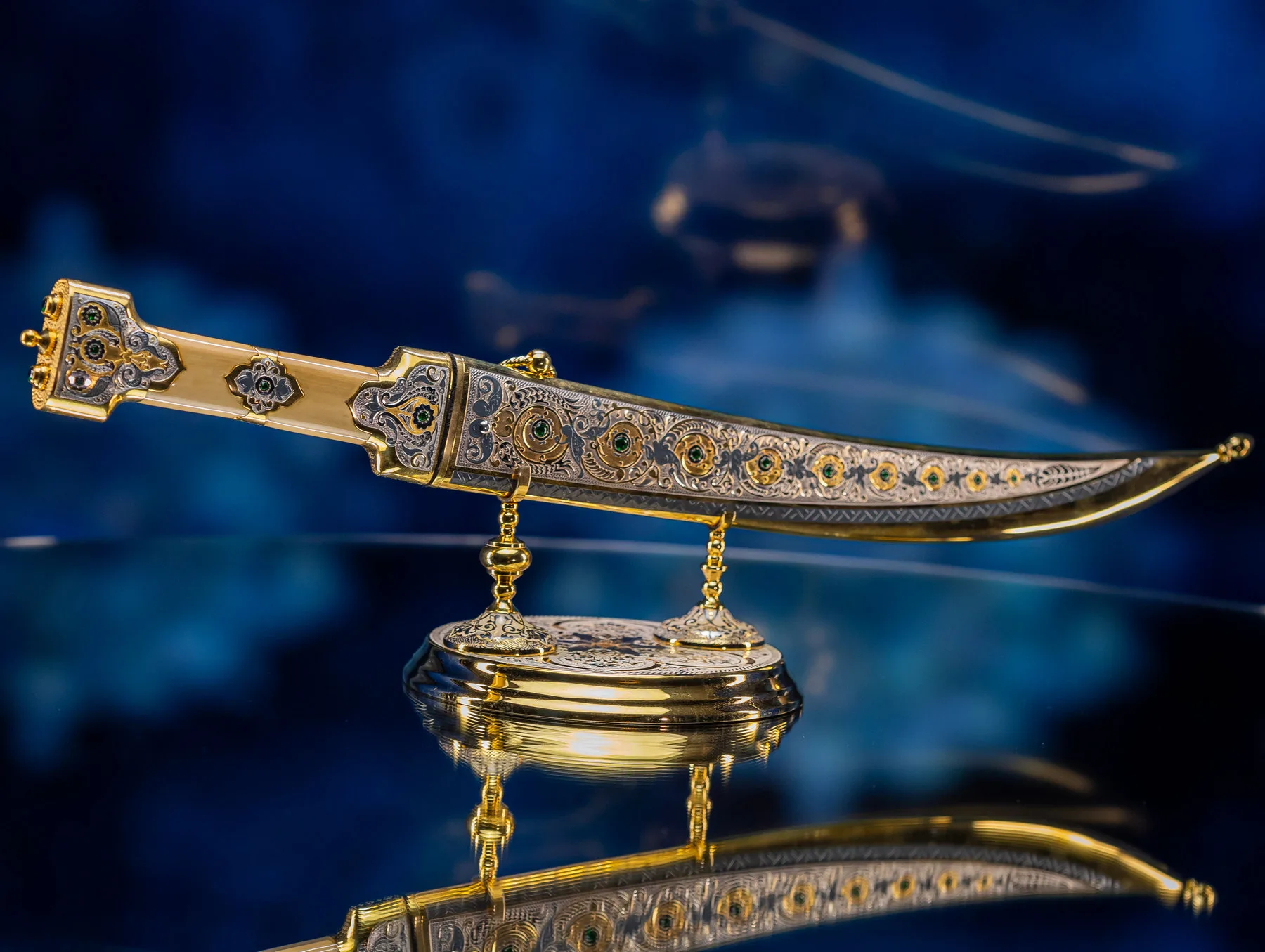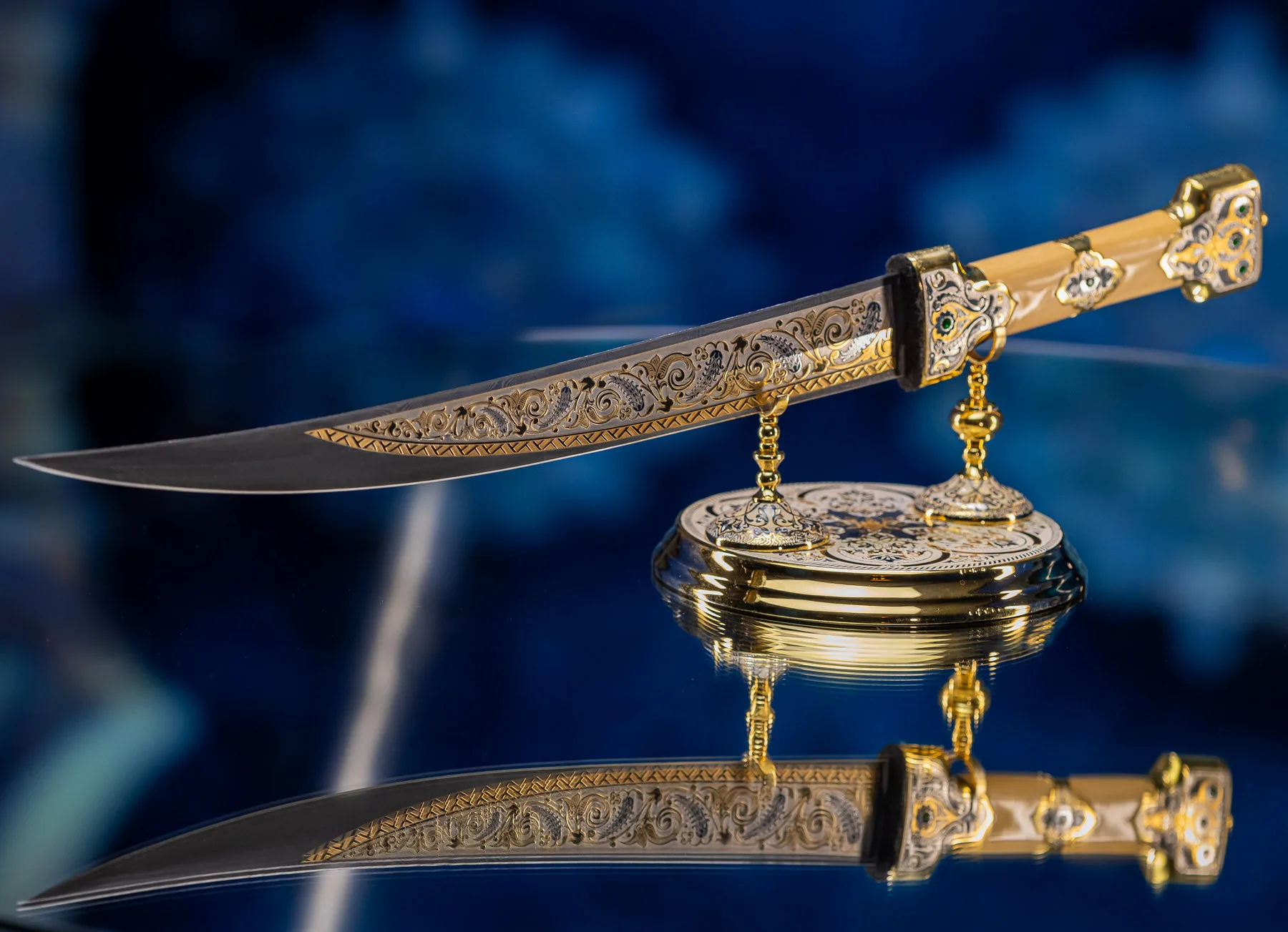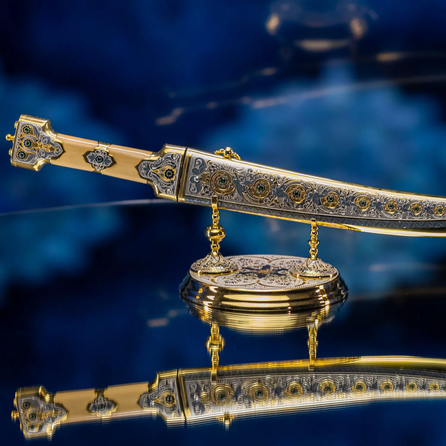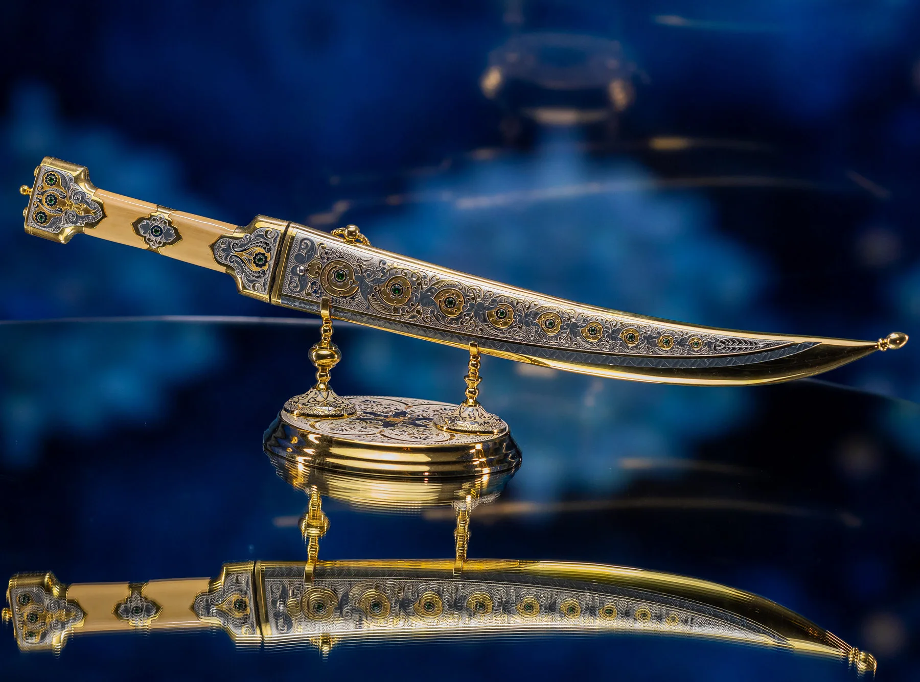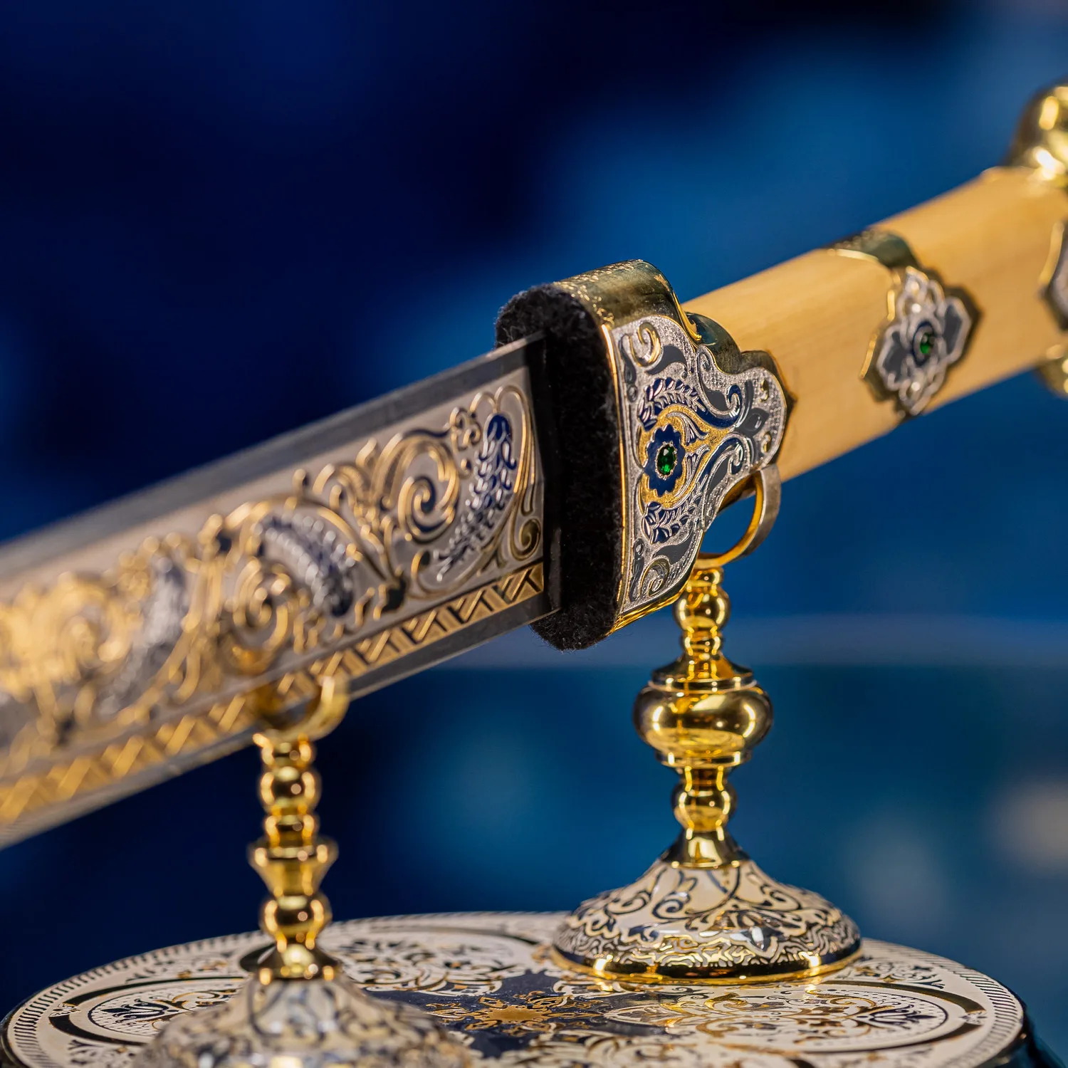 Роскошная отделка сочетает благородное золото с филигранной серебряной работой, украшенной традиционными орнаментами. Рукоять декорирована изысканными узорами, каждый завиток которых рассказывает историю о чести и доблести. Драгоценные камни, искусно вправленные в металл, мерцают подобно звездам в ночном небе, подчеркивая исключительность изделия.