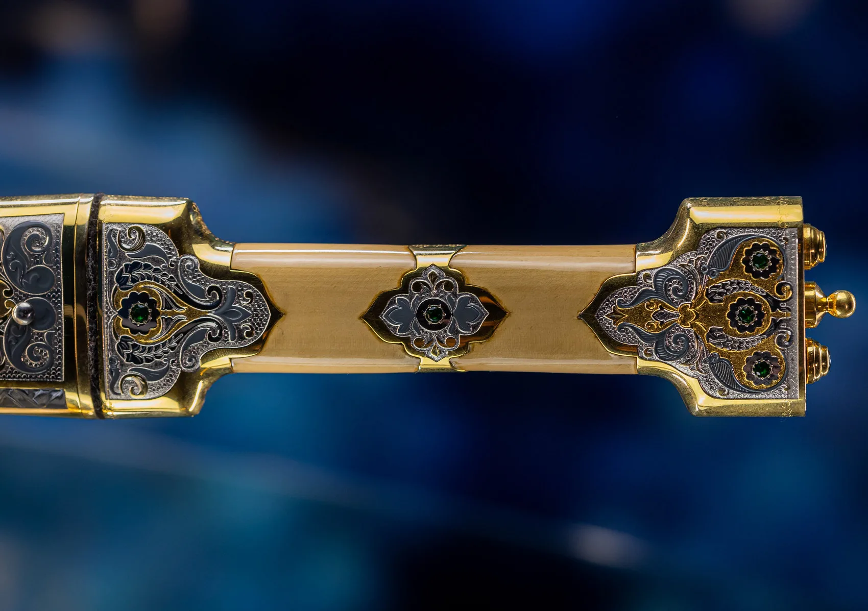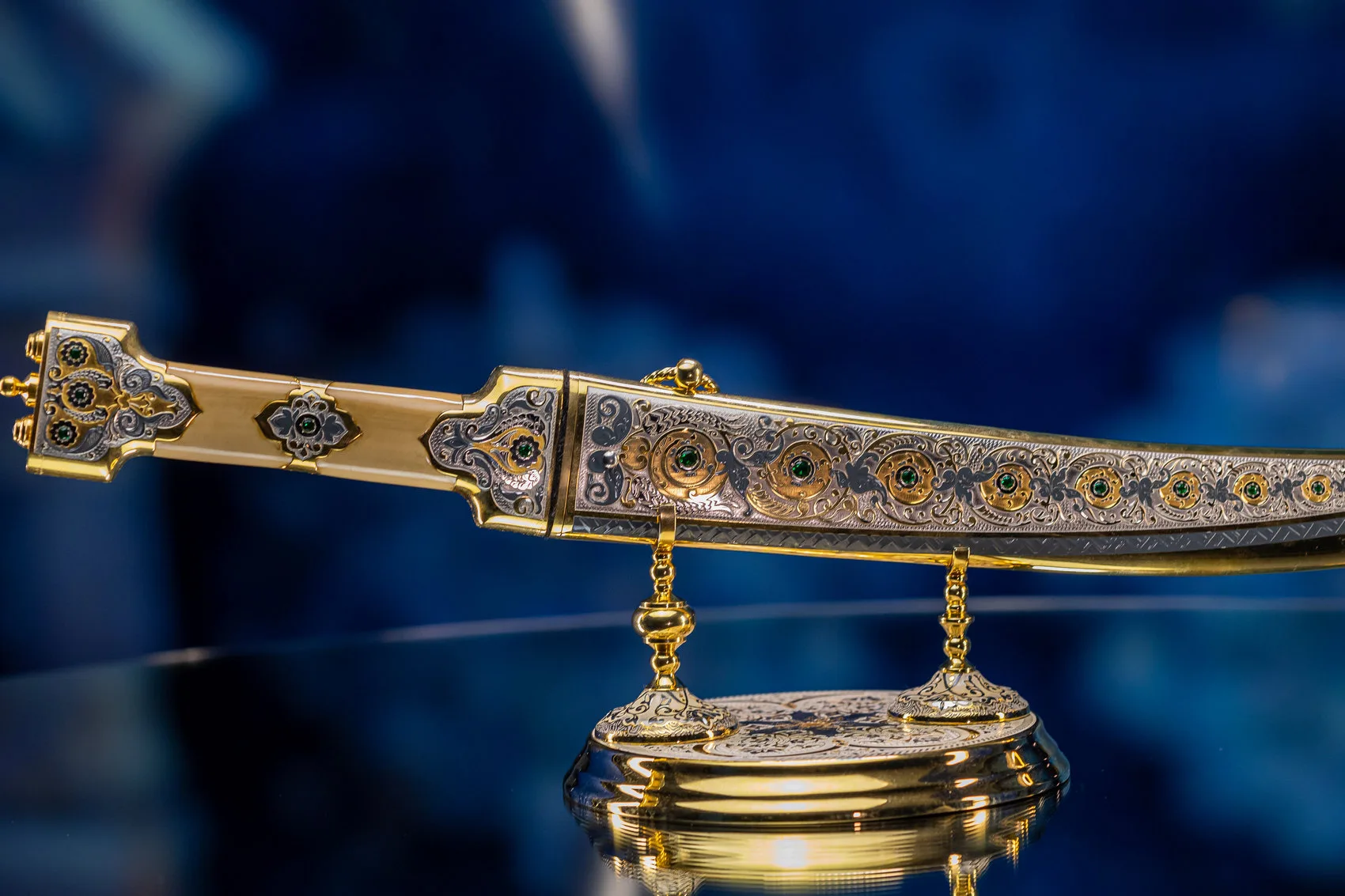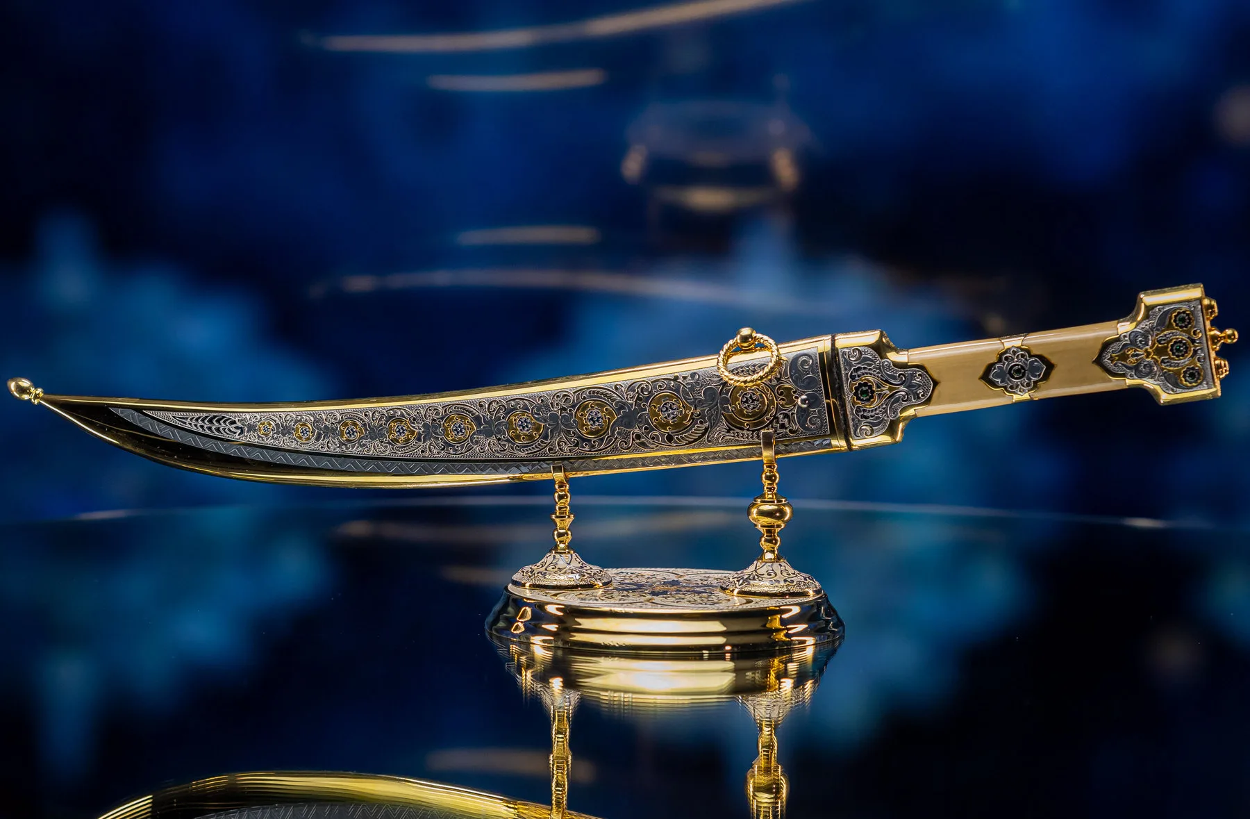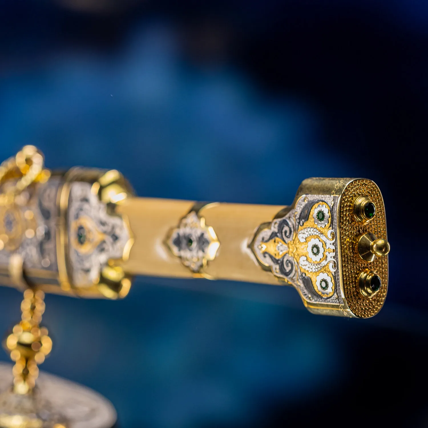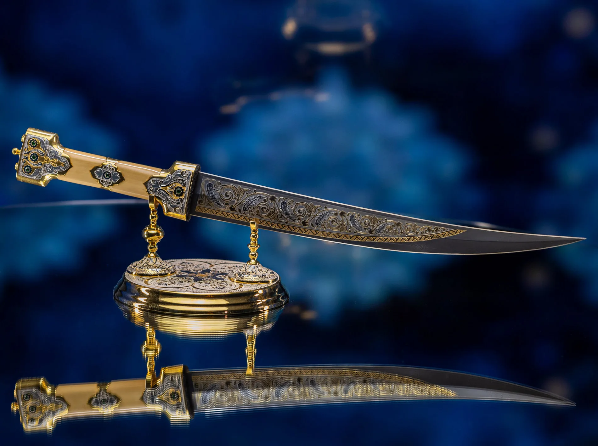 Роскошная отделка сочетает благородное золото с филигранной серебряной работой, украшенной традиционными орнаментами. Рукоять декорирована изысканными узорами, каждый завиток которых рассказывает историю о чести и доблести. Драгоценные камни, искусно вправленные в металл, мерцают подобно звездам в ночном небе, подчеркивая исключительность изделия.