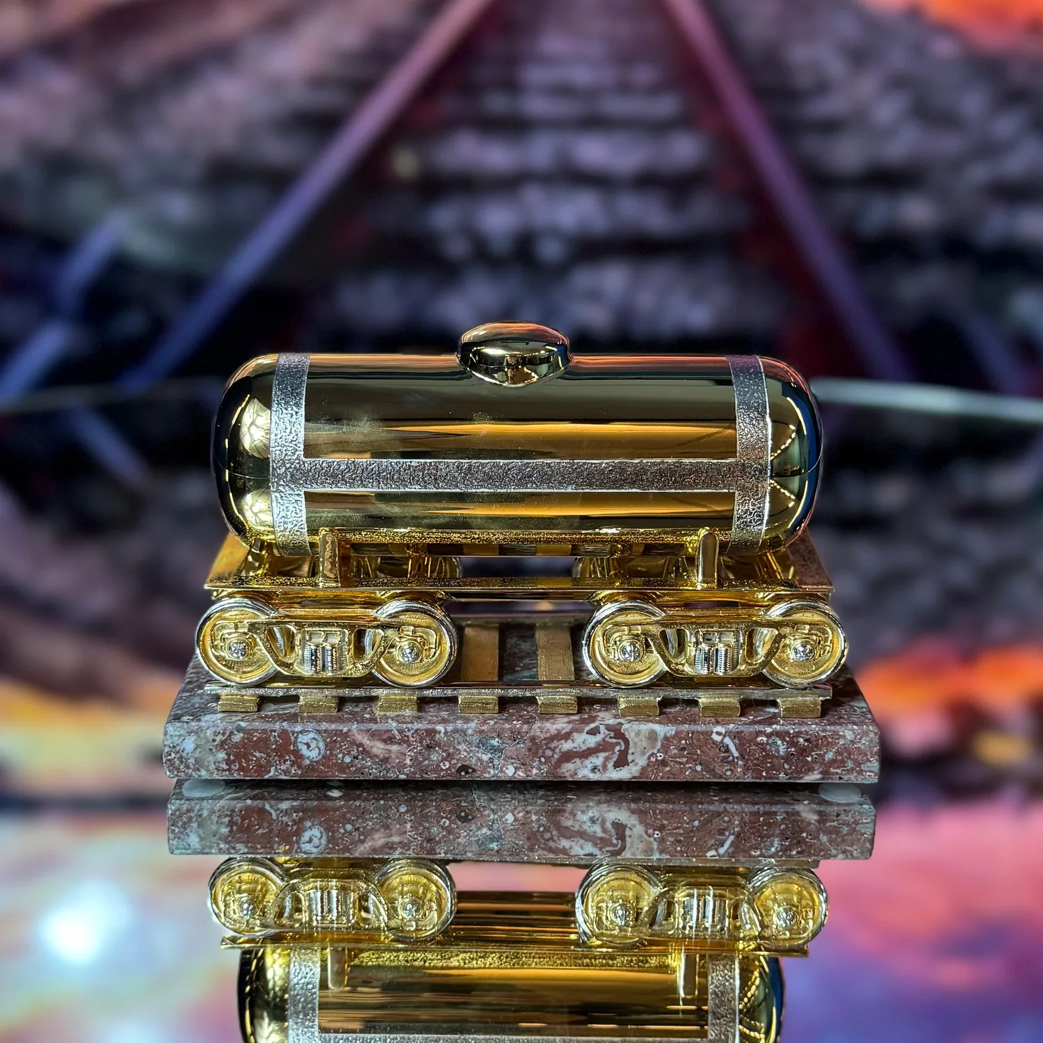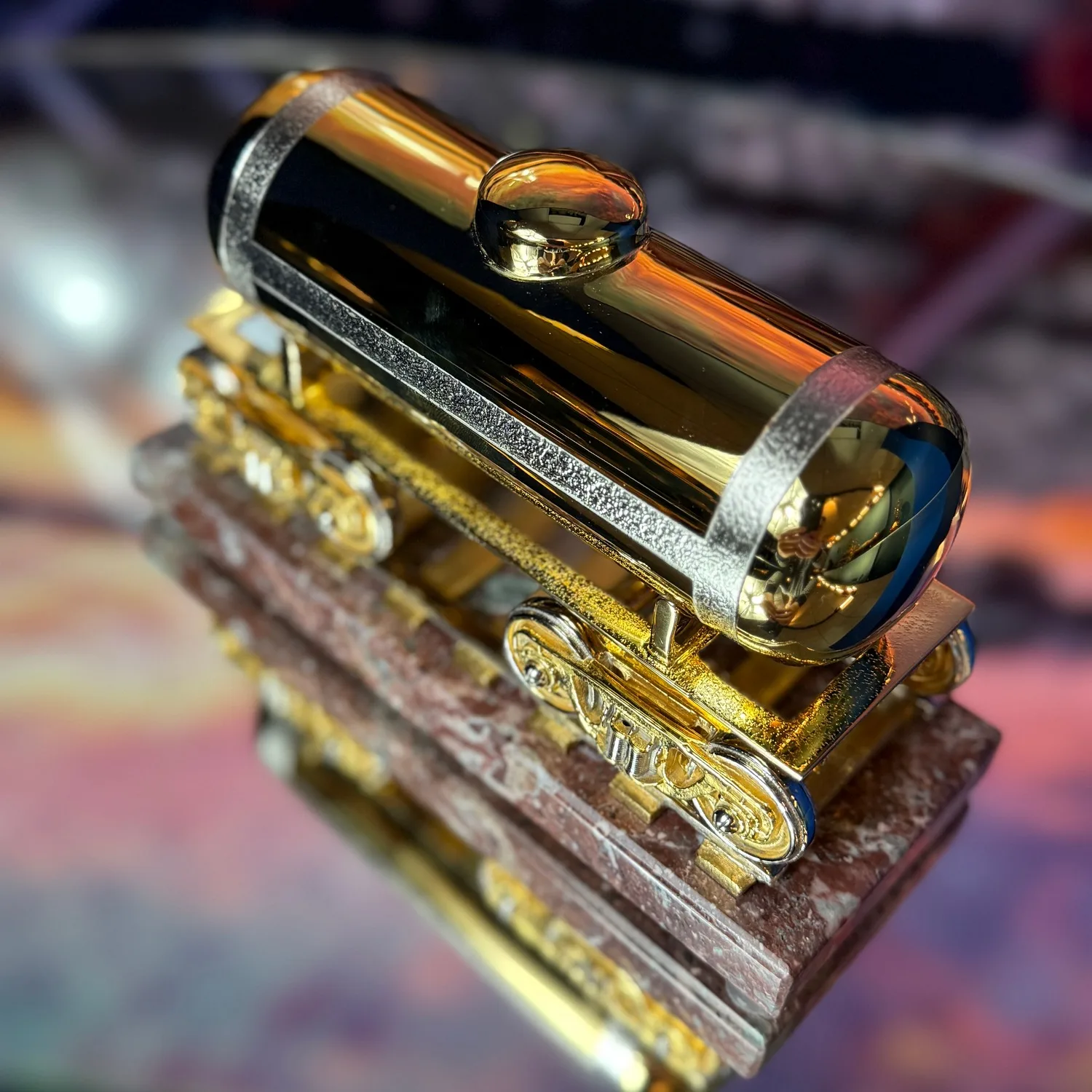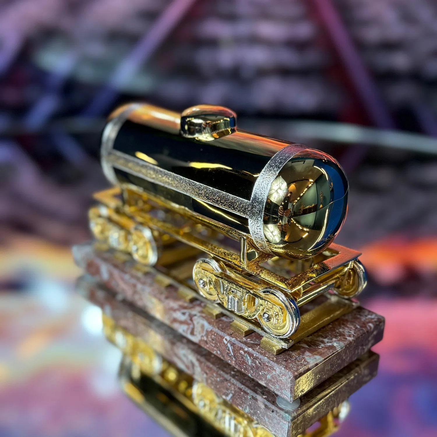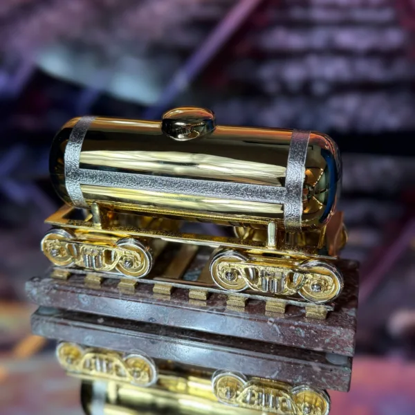 Эксклюзивный сувенир, который вдохновляет! Цистерна в изысканном золотом исполнении – это не просто украшение, а символ мощности, надежности и непрерывного движения вперед. Каждая деталь проработана с ювелирной точностью, а благородное основание из натурального камня подчеркивает статус и стиль. Добавьте в свою коллекцию частичку индустриальной эстетики, или преподнесите этот роскошный сувенир в подарок – он станет ярким акцентом в интерьере и расскажет о вашем вкусе. Выбирайте красоту, запечатленную в металле, и вдохновляйтесь каждый день!